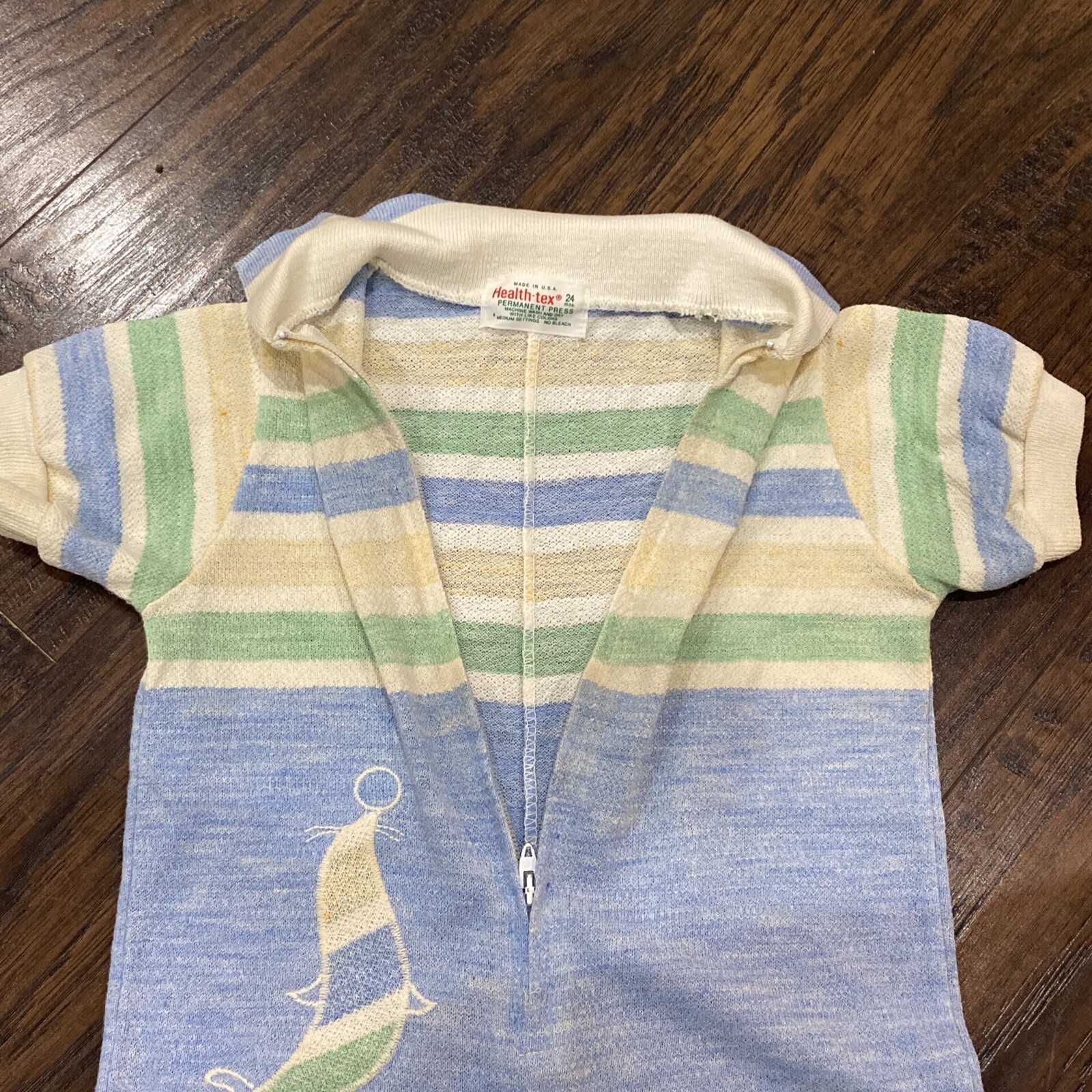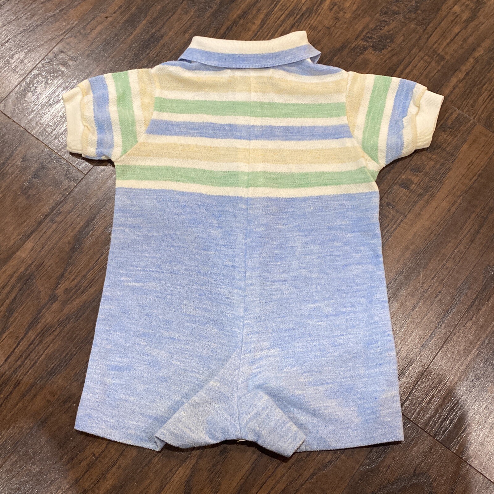 как выглядит Vintage Baby Boy Health-Tex Blue Green Yellow Zipper Romper One Piece Striped фото