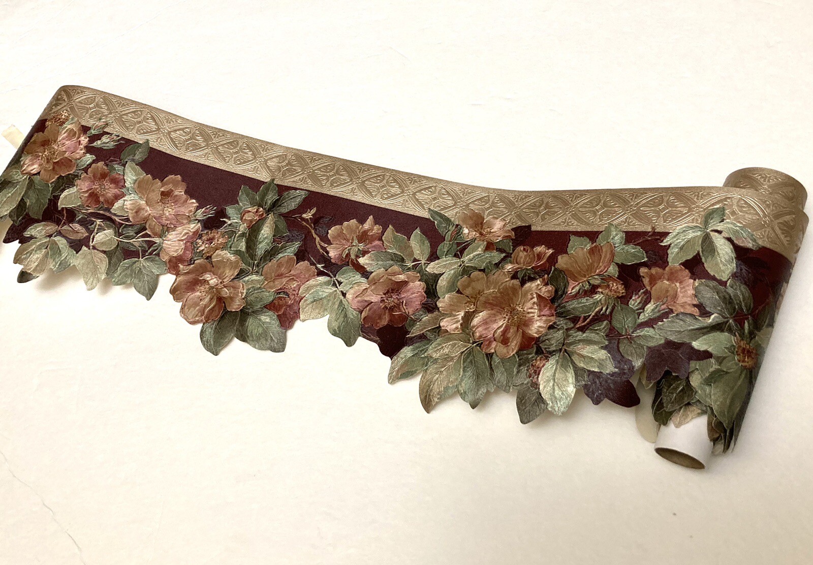 MPN: Pre-Cut Decorative Edge Border, Die Cut Scalloped Border Roll, Brewster 951B55905, Burgundy Red, Victorian Antique Style, Silk