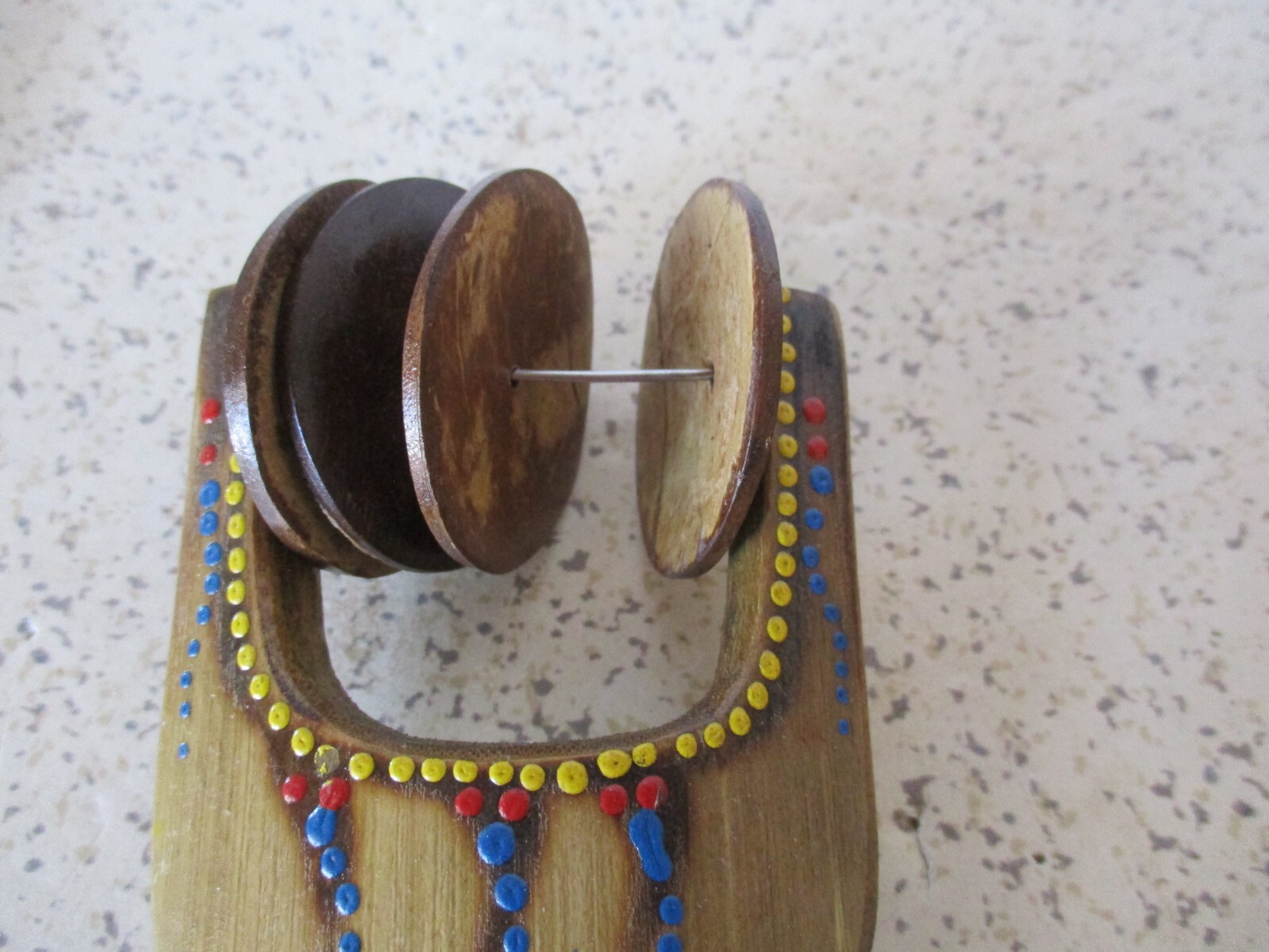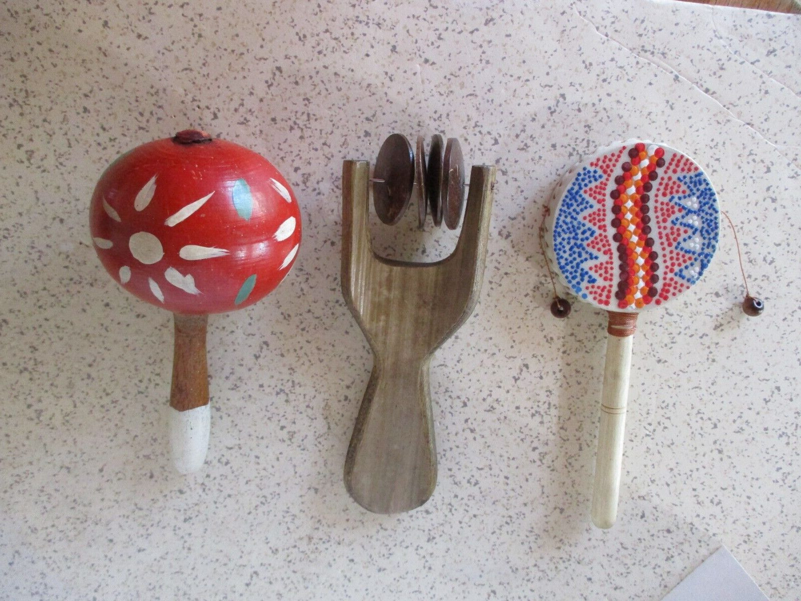 как выглядит 3 HANDCRAFTED MUSICAL INSTRUMENTS, MAROCCA, TWIRL DRUM SHAKE CYMBALS, VG фото