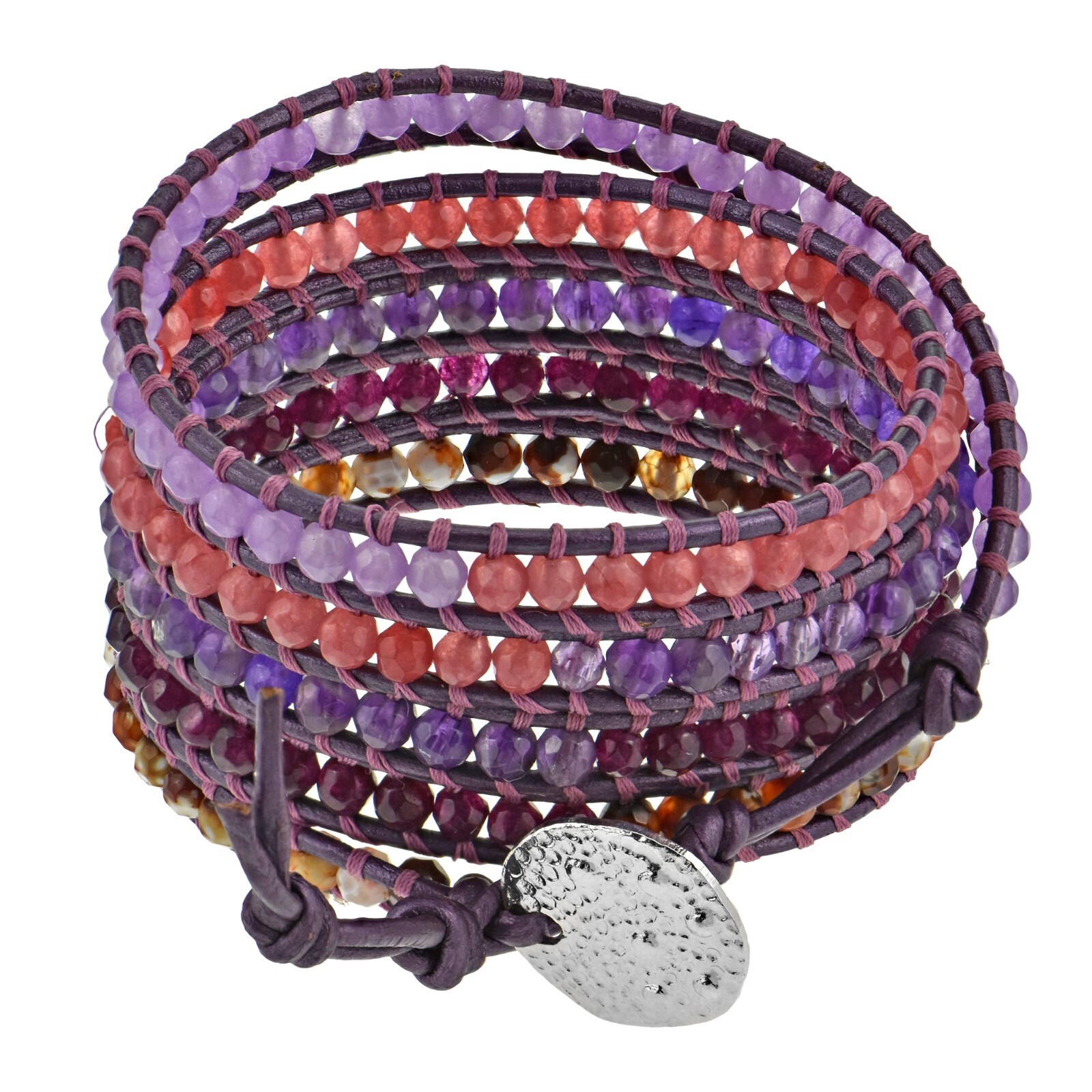 Boho Style Purple Tones Mixed Stones on Leather Five Layer Wrap Bracelet