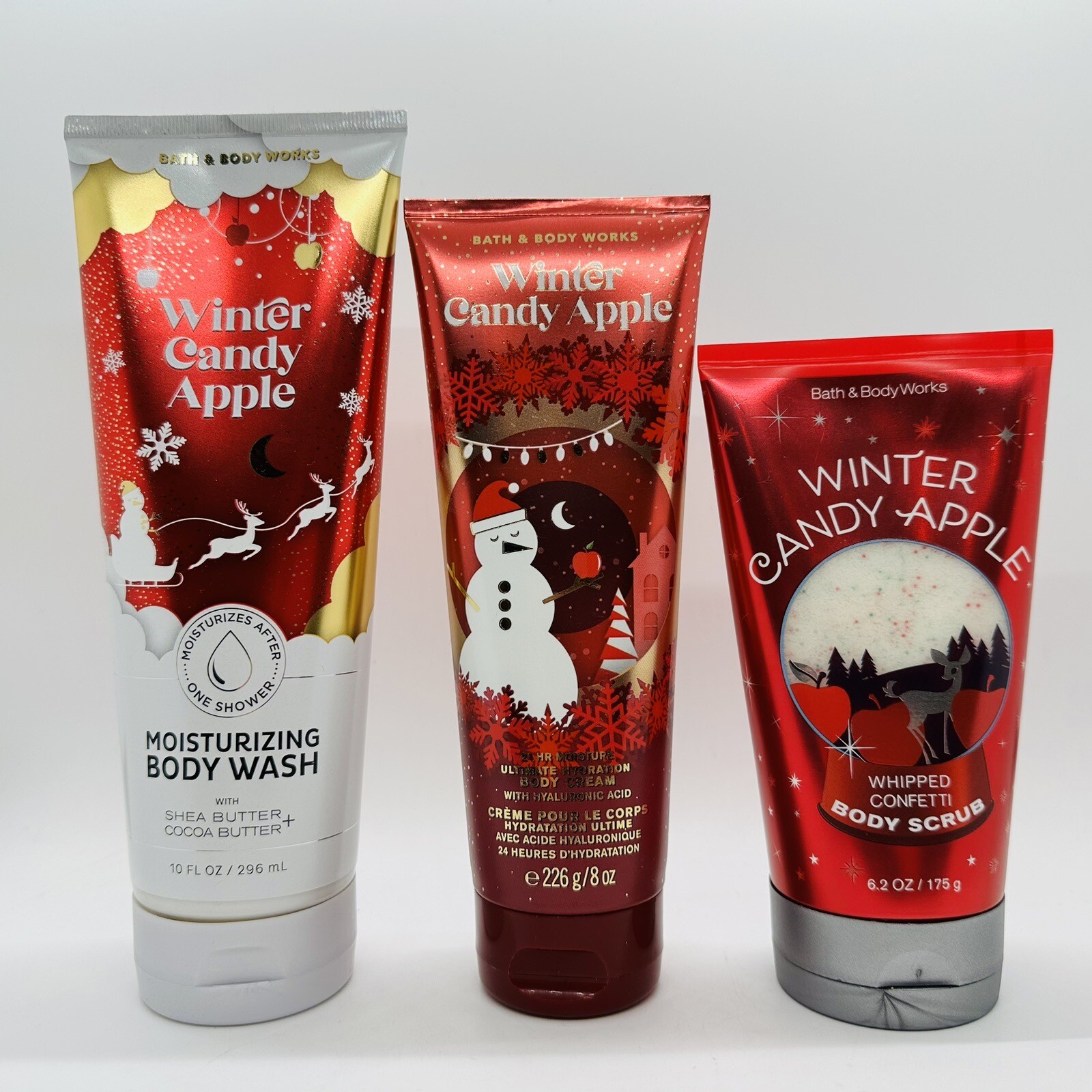 NEW SET 3 PCS BATH BODY WORKS WINTER CANDY APPLE BODY WASH, CREAM SCRUB