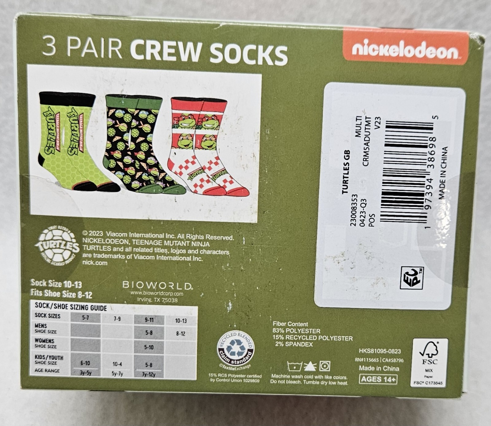 Teenage Mutant Ninja Turtles Men's 3 Pair Crew Socks Fits Shoe Size 8-12/New
