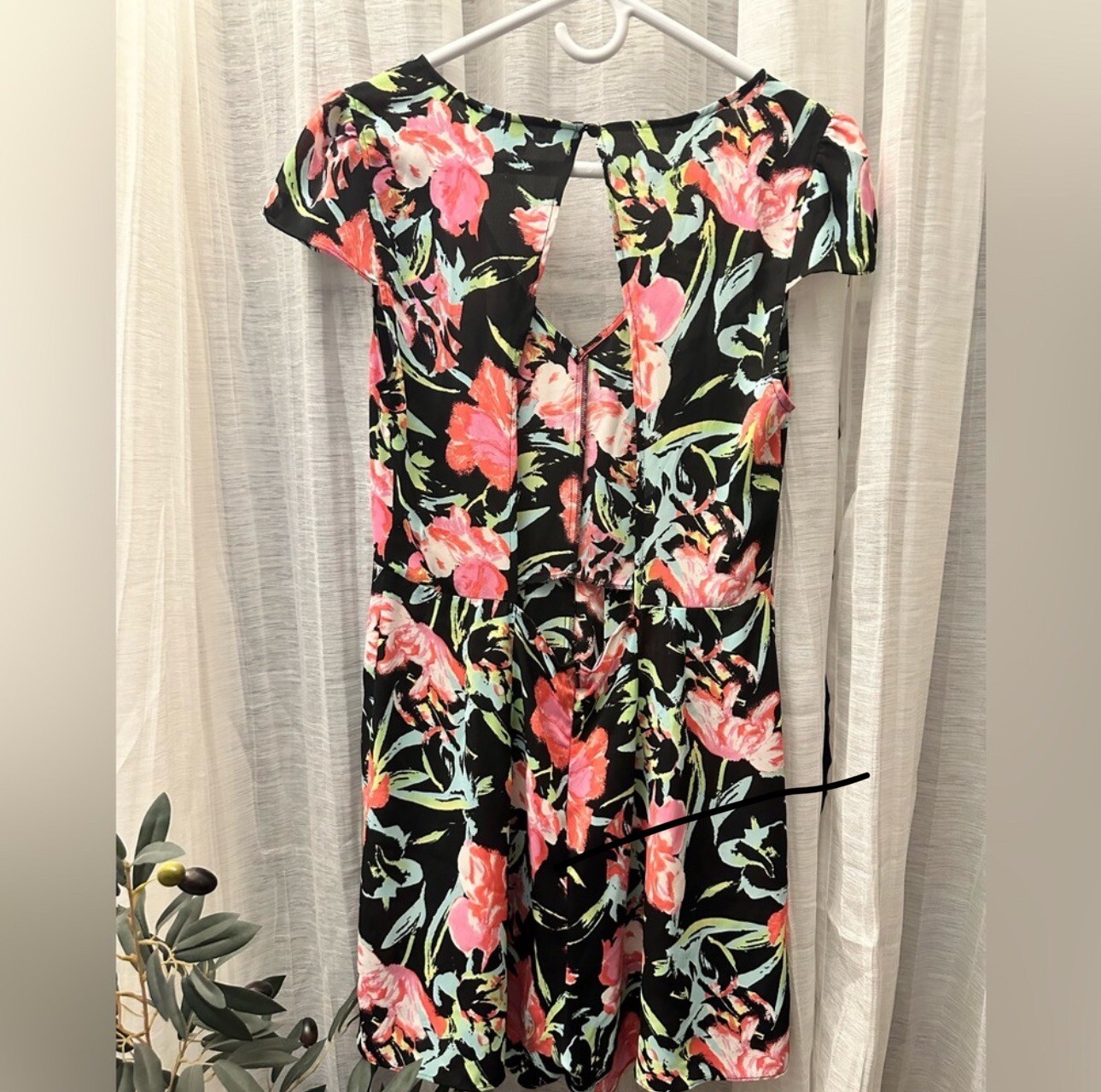 как выглядит Leith Floral Romper Shorts M Open Keyhole Back Cap Sleeve V-Neck Black Red фото