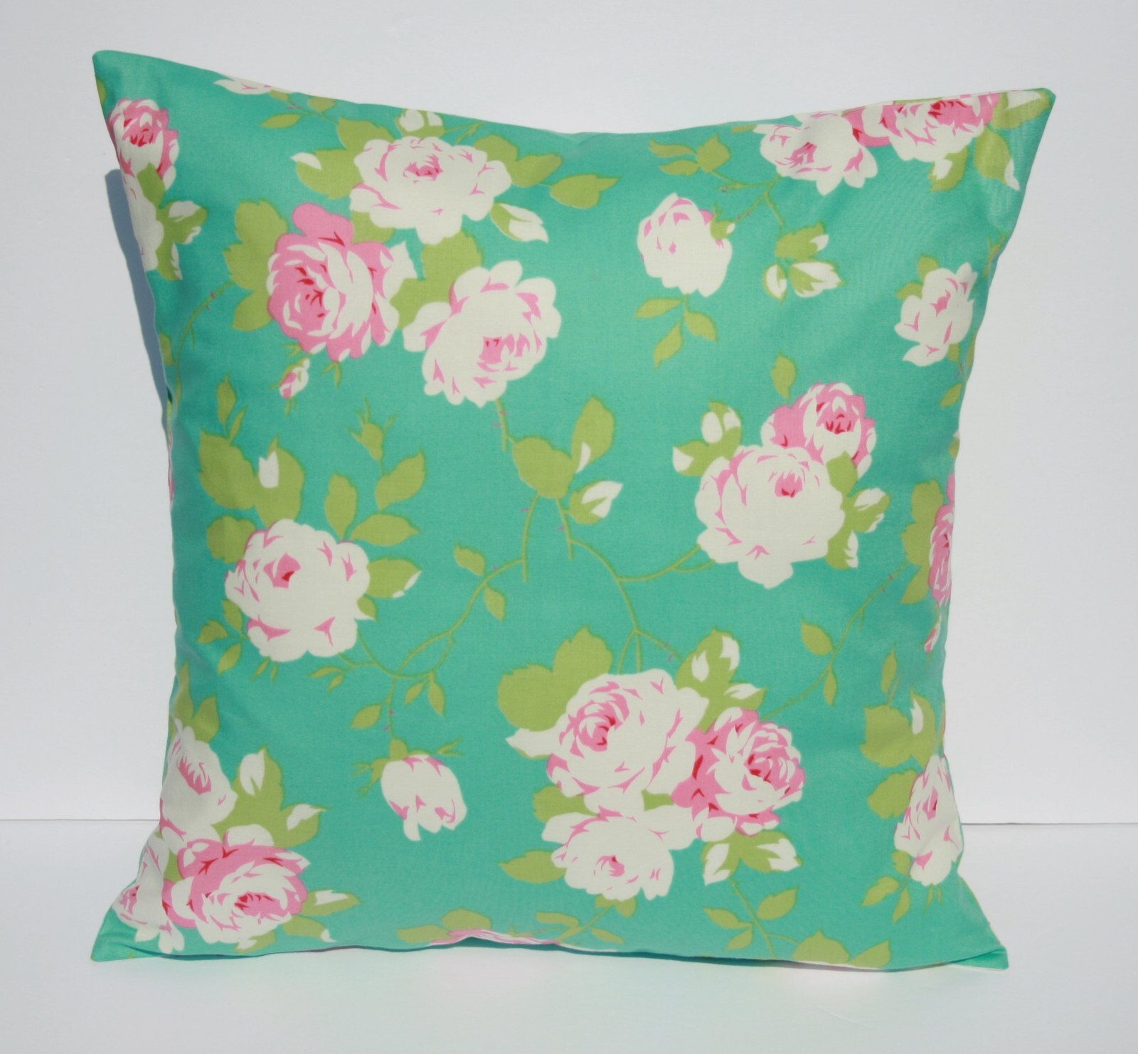 16 Throw Pillow Cover Pink Roses Flowers on Green 16x16 Inch Accent Cover