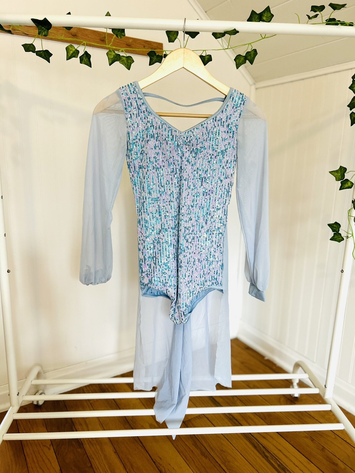 как выглядит Weissman Blue Sequin Leotard With Sheer Sleeves And Sheer Skirt, Crisscross Back фото