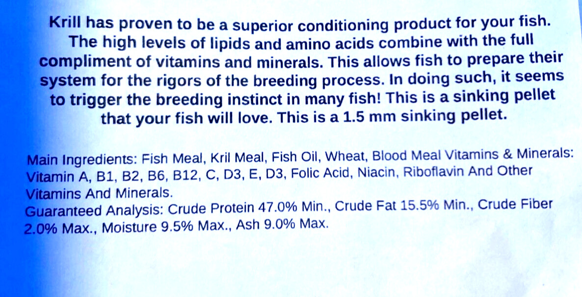 1/2 LB Premium Krill Cichlid 1.5 mm Sinking Pellet Bottom Feeder Food