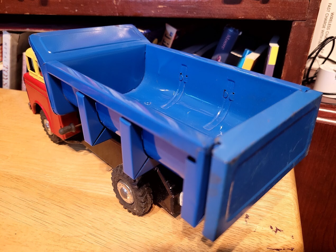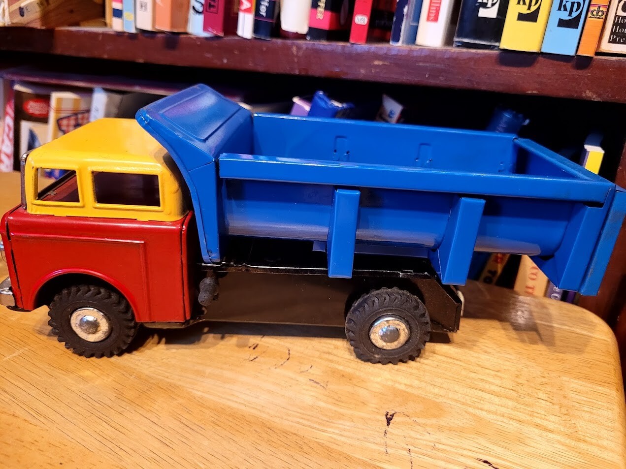 NICE VINTAGE 1950'S CRAGSTAN TIN LITHO TRI-COLOR FRICTION HYDRAULIC DUMP TRUCK