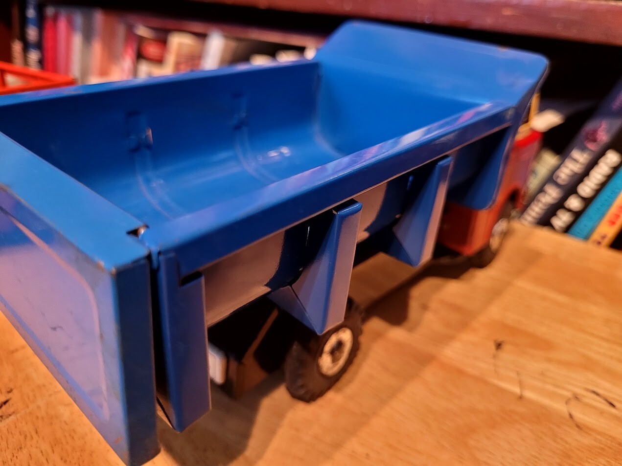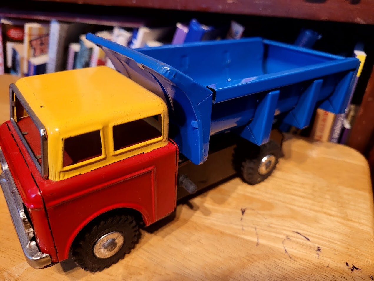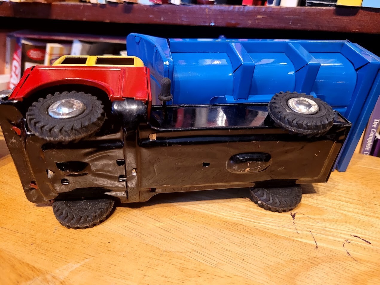 как выглядит NICE VINTAGE 1950S CRAGSTAN TIN LITHO TRI-COLOR FRICTION HYDRAULIC DUMP TRUCK фото