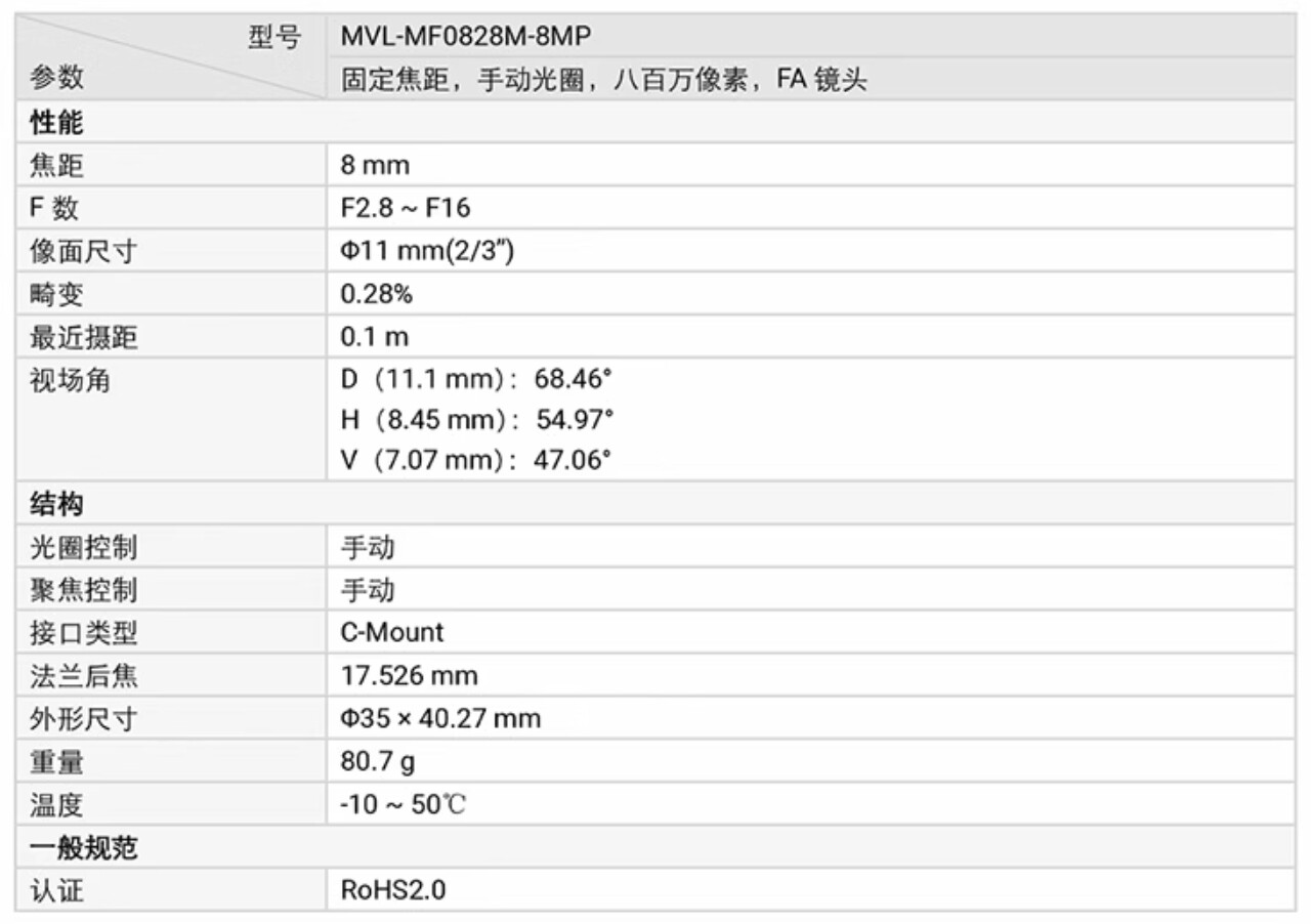 HIKROBOT Industrial Camera Lens MVL-MF0828M-8MP C-Mount 8MP 2/3 8mm
