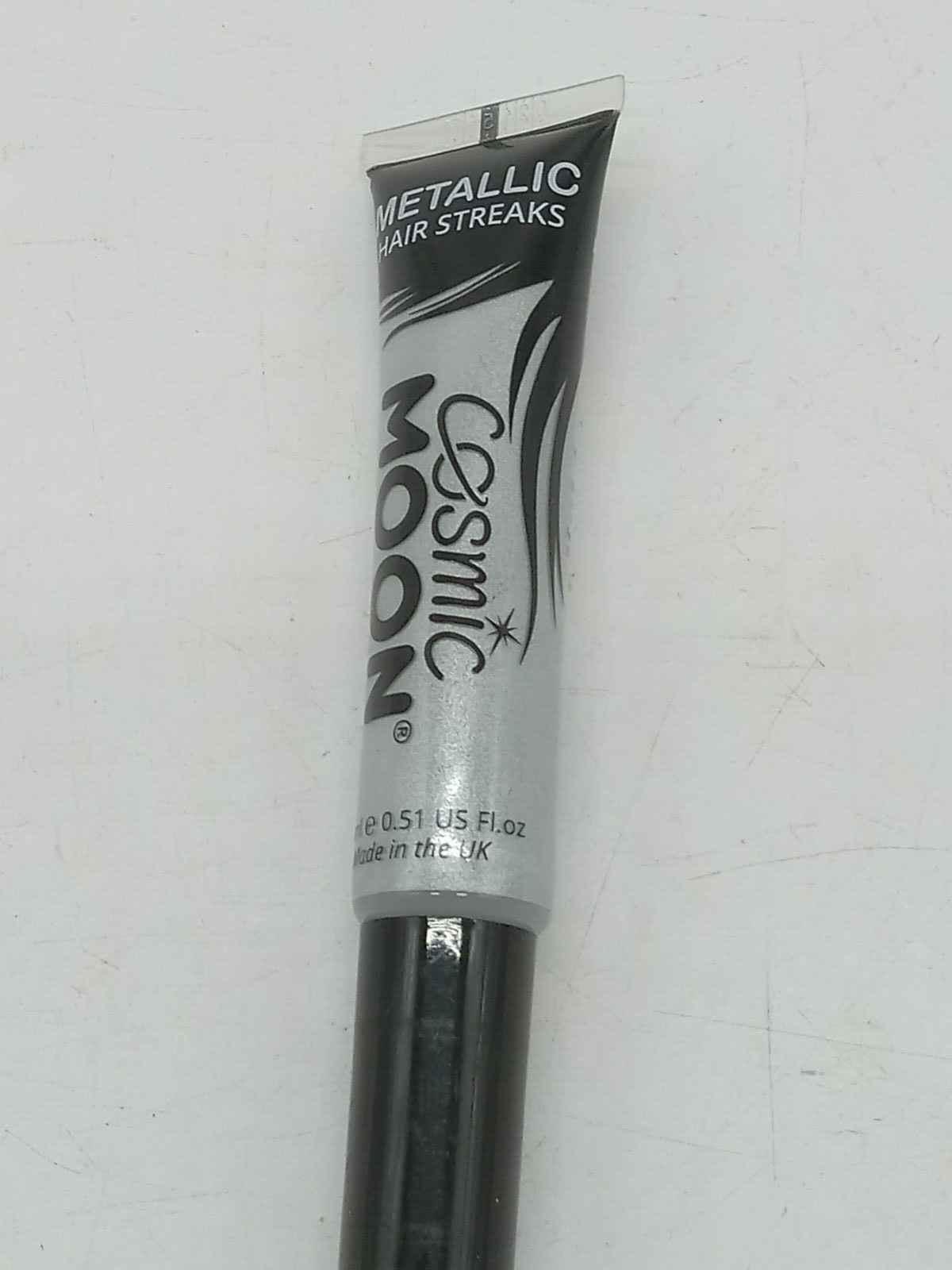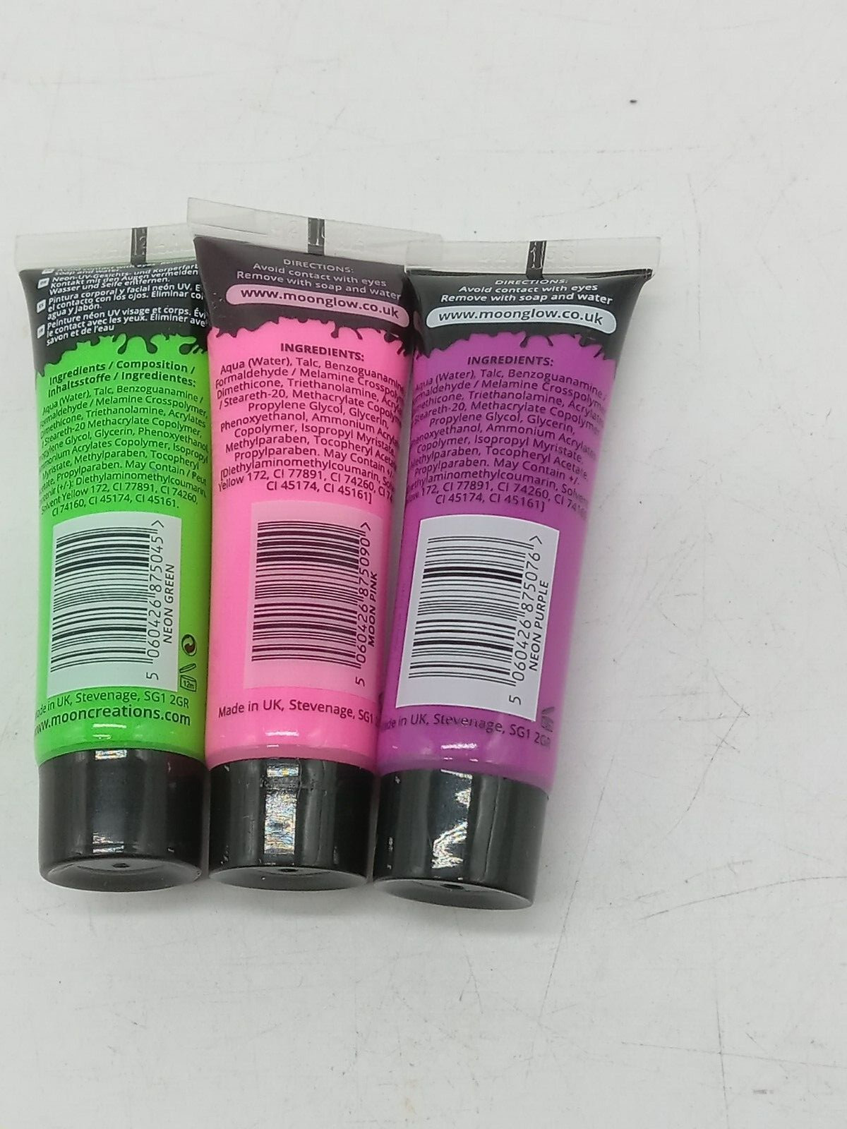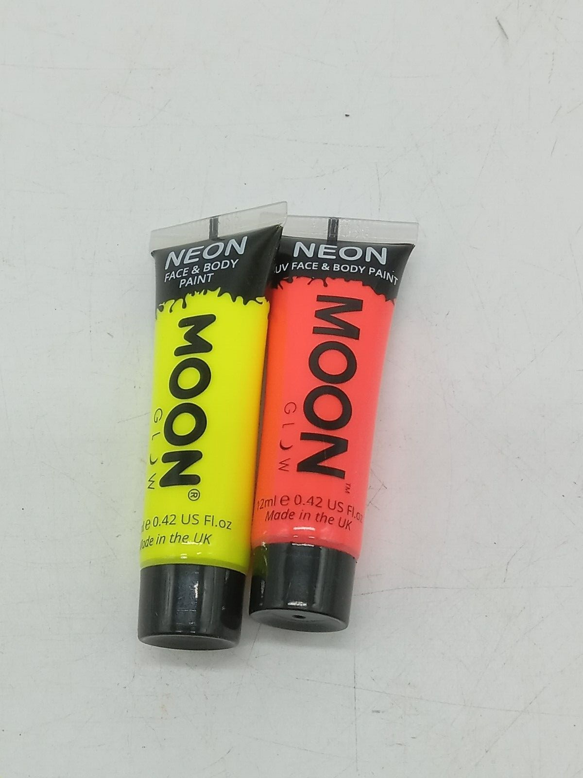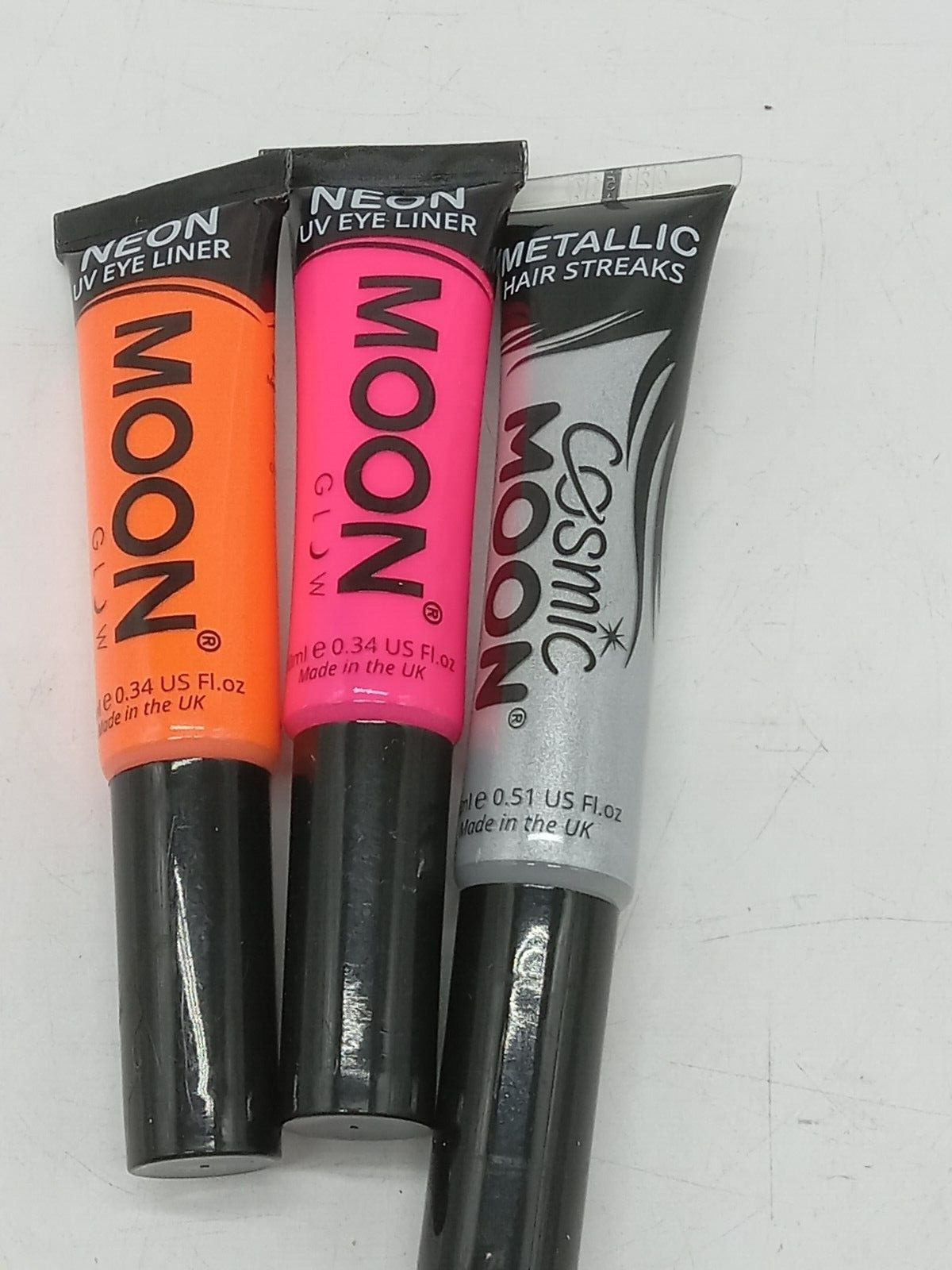 Moon Glow neon face body paints, neon eyeliner, metallic hair streaks