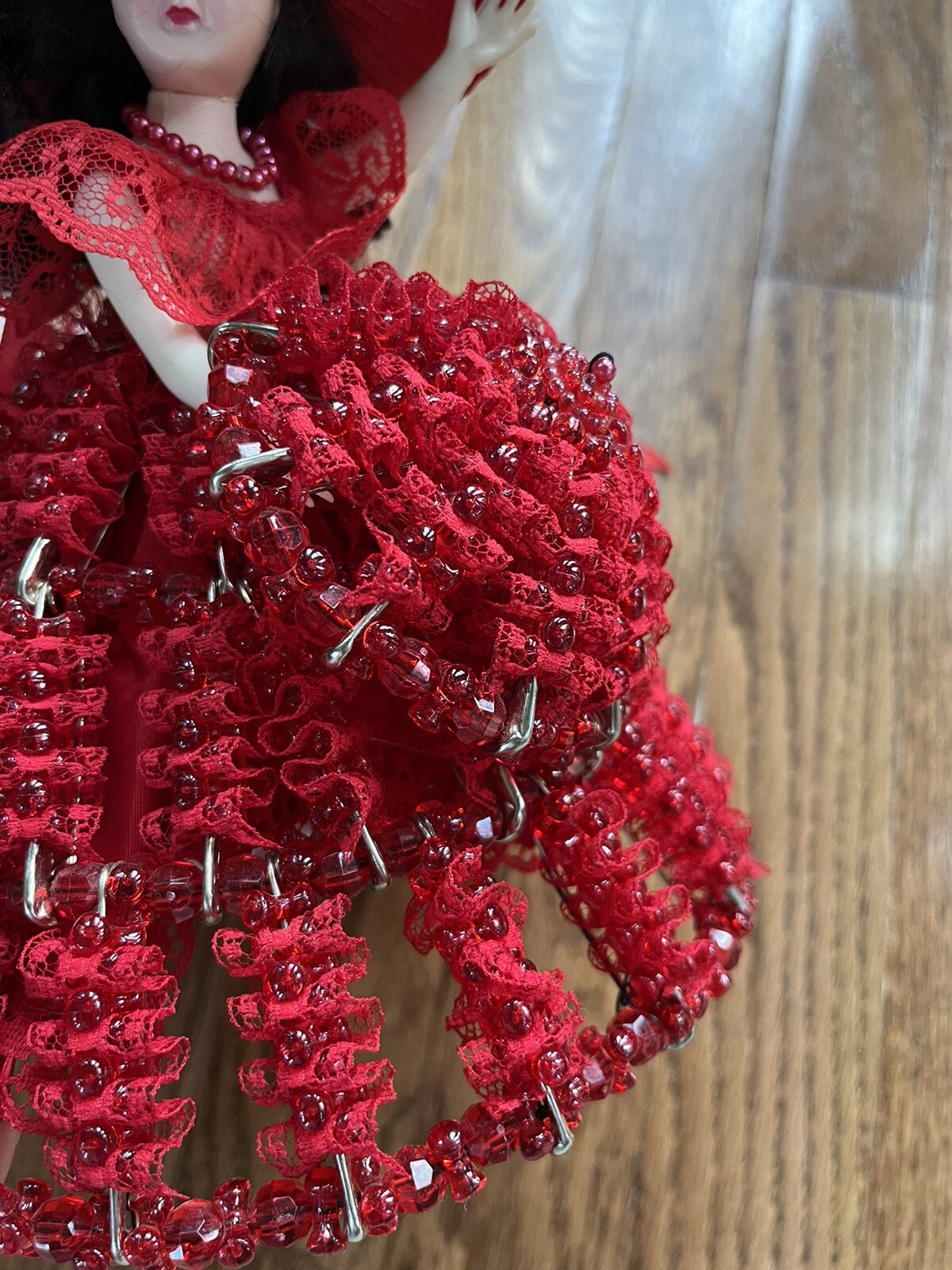 как выглядит Vintage 1950 Beaded Doll Red Estate Umbrella Dress Plastic Safety Pin фото
