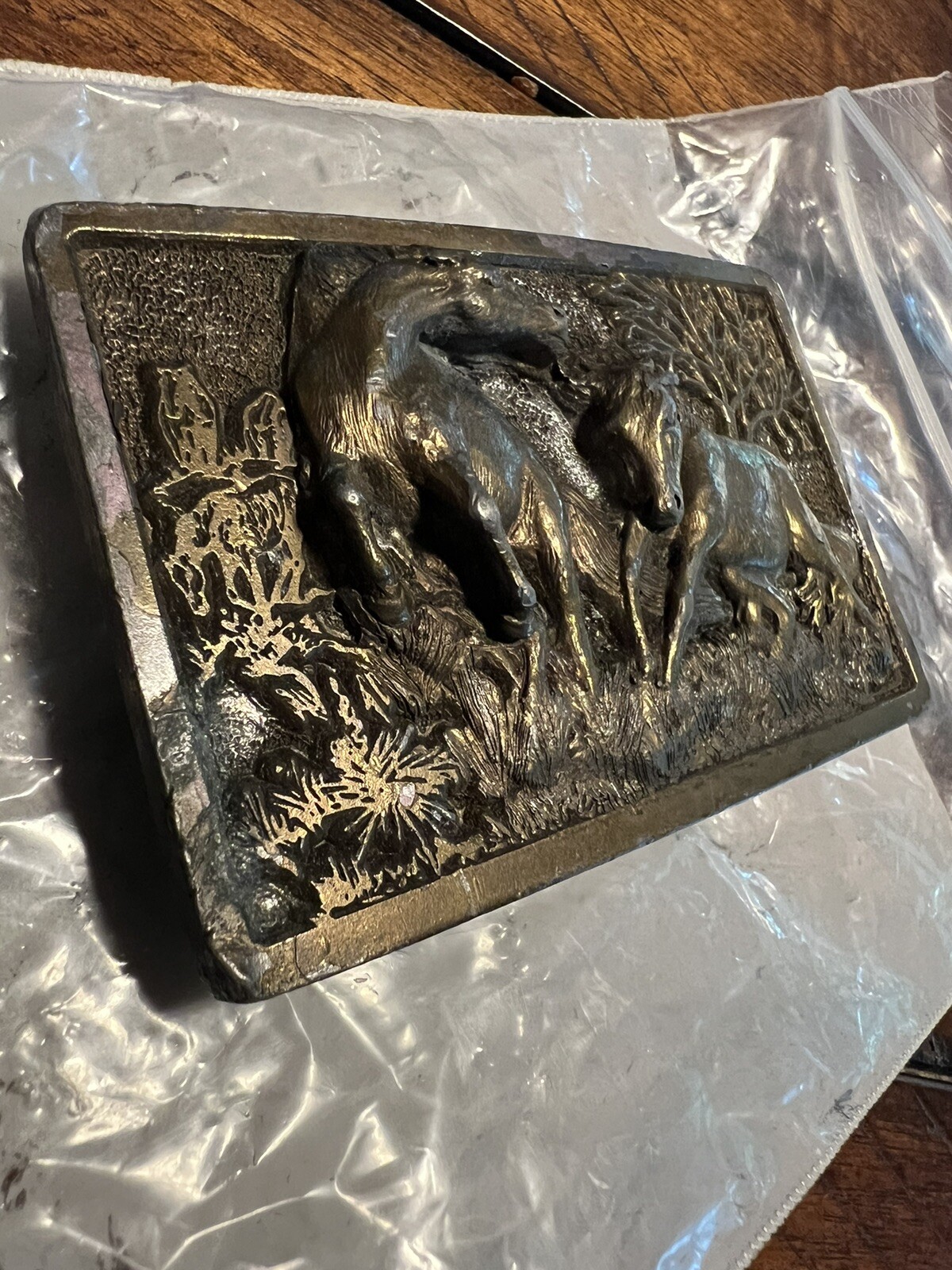 как выглядит Vintage Solid Brass Belt Buckle Bronco Wild Horses 1978 USA фото