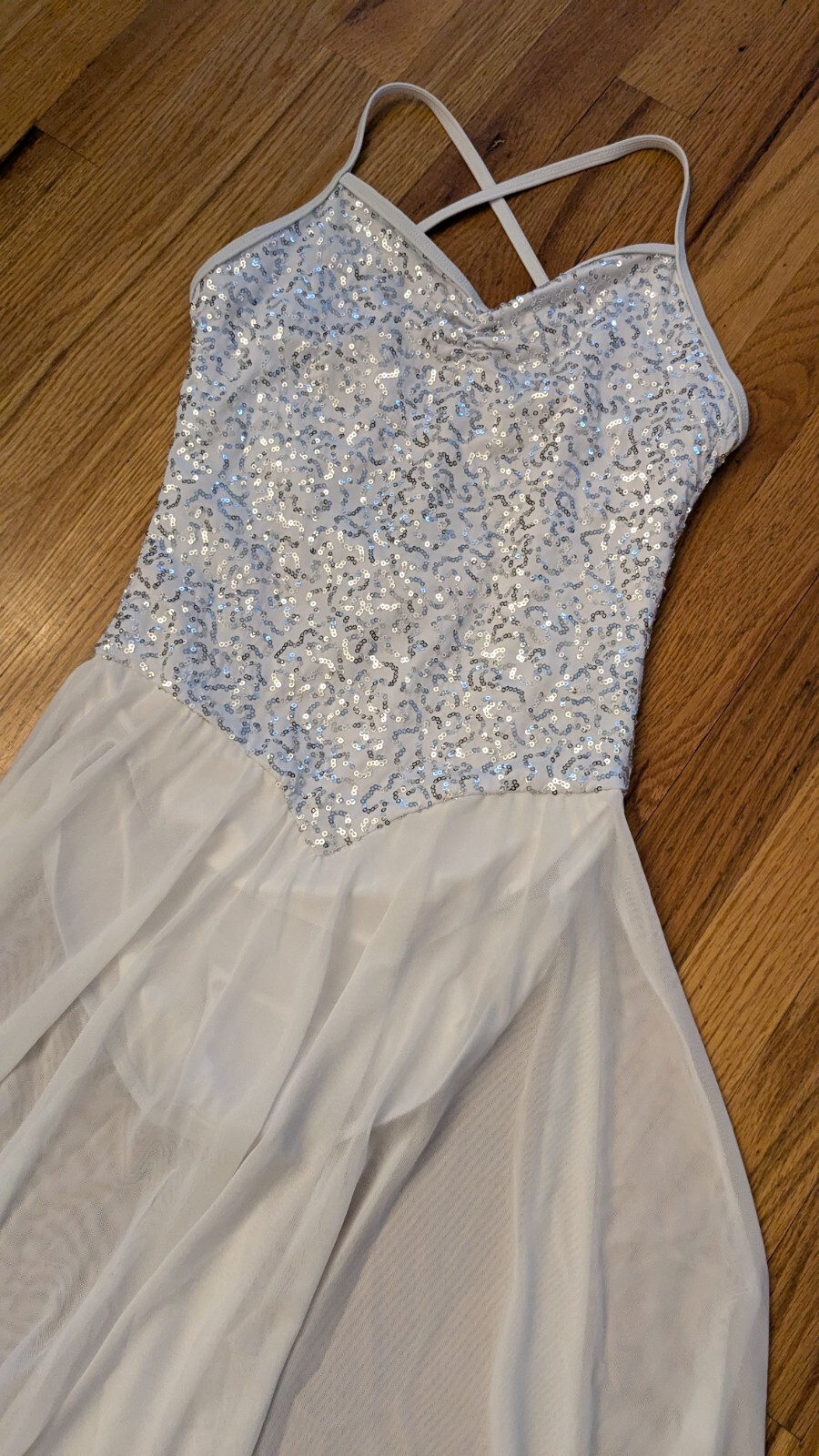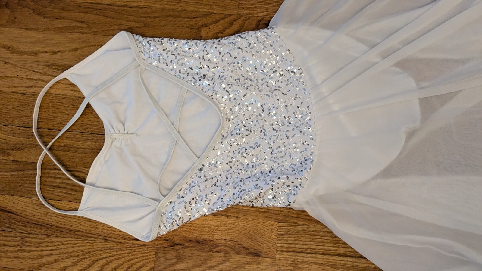 BALERA Ballet dance dress white silver sequin cross-strap back hi lo hem knit S