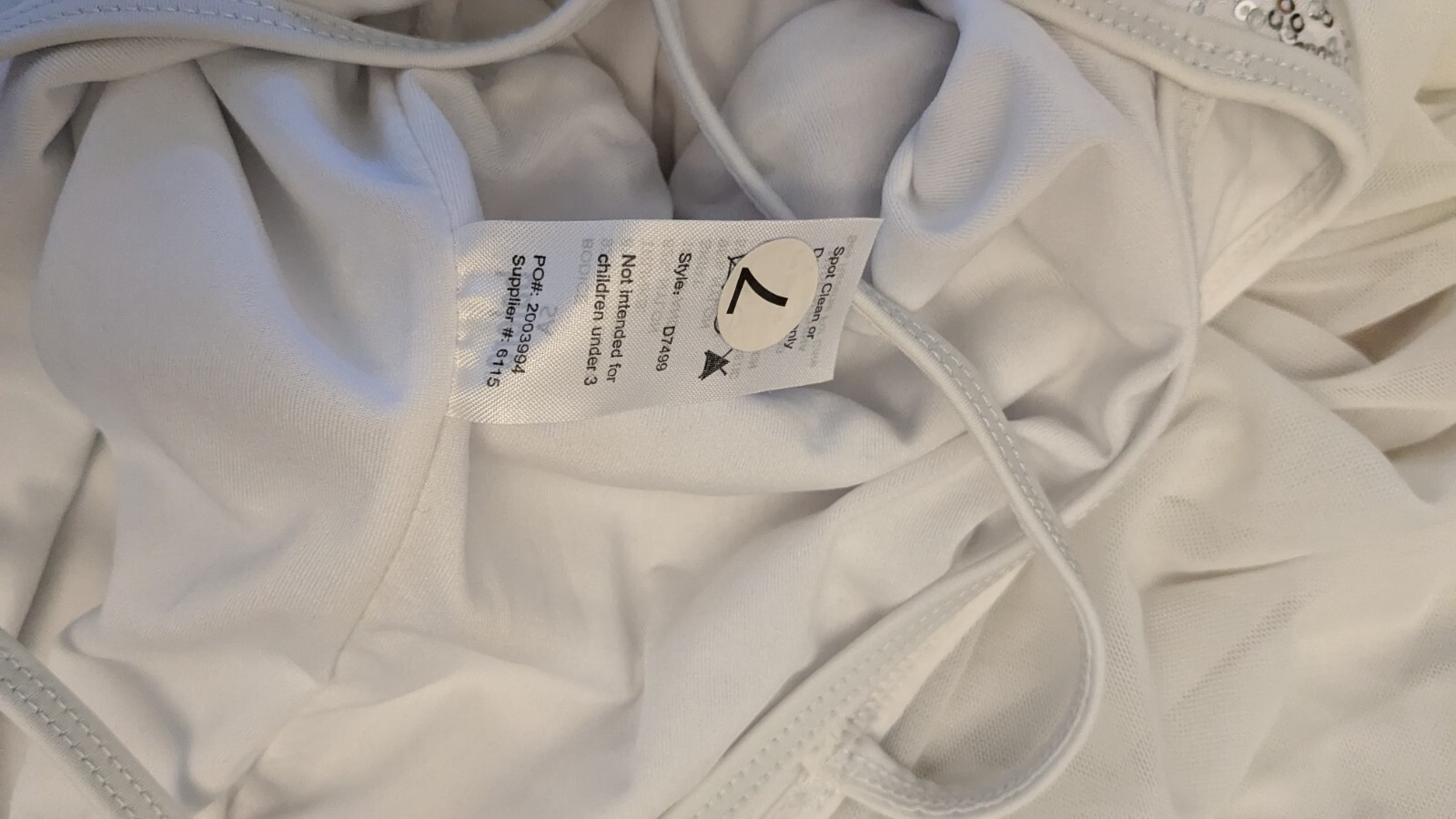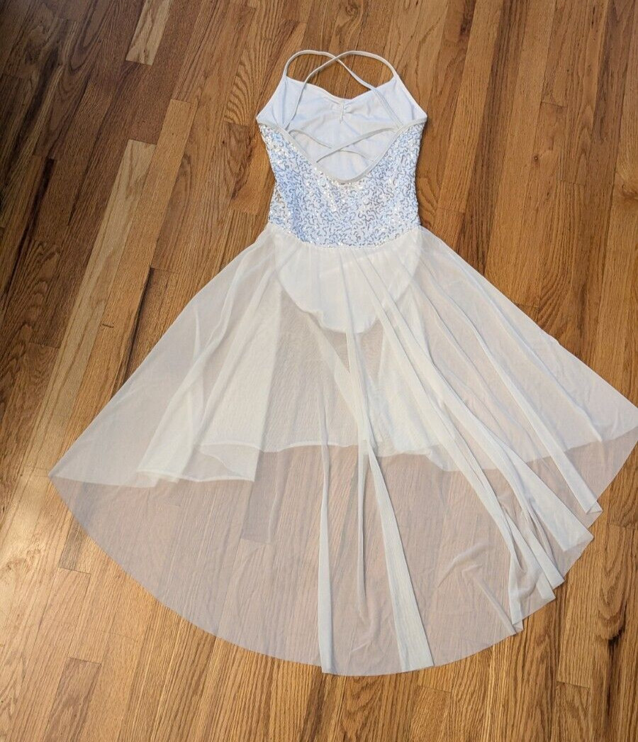 как выглядит BALERA Ballet dance dress white silver sequin cross-strap back hi lo hem knit S фото