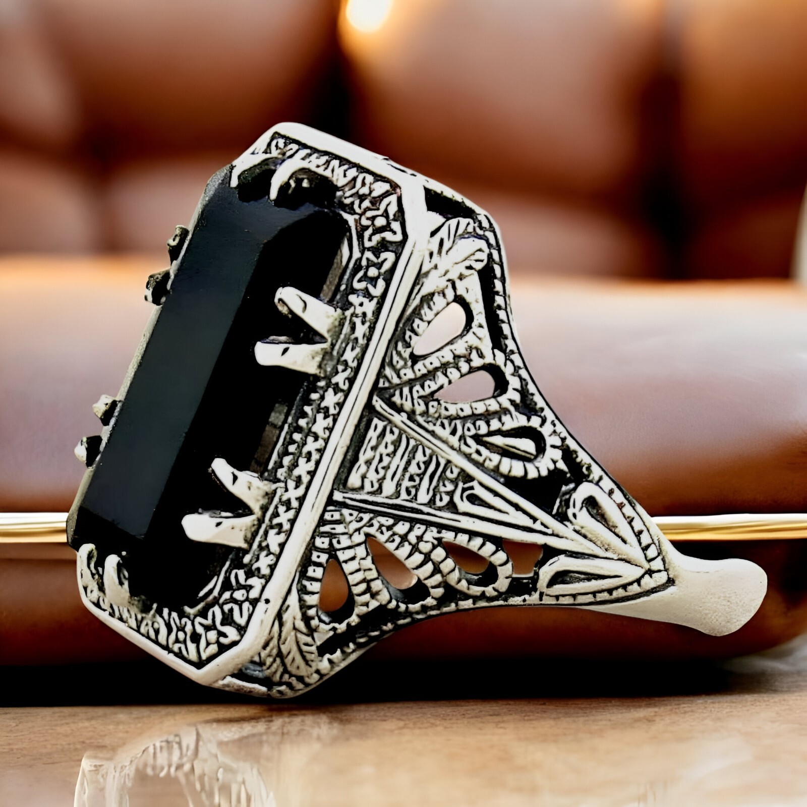 как выглядит BLACK AGATE 925 SOLID STERLING SILVER DECO ANTIQUE STYLE FILIGREE RING  765 фото