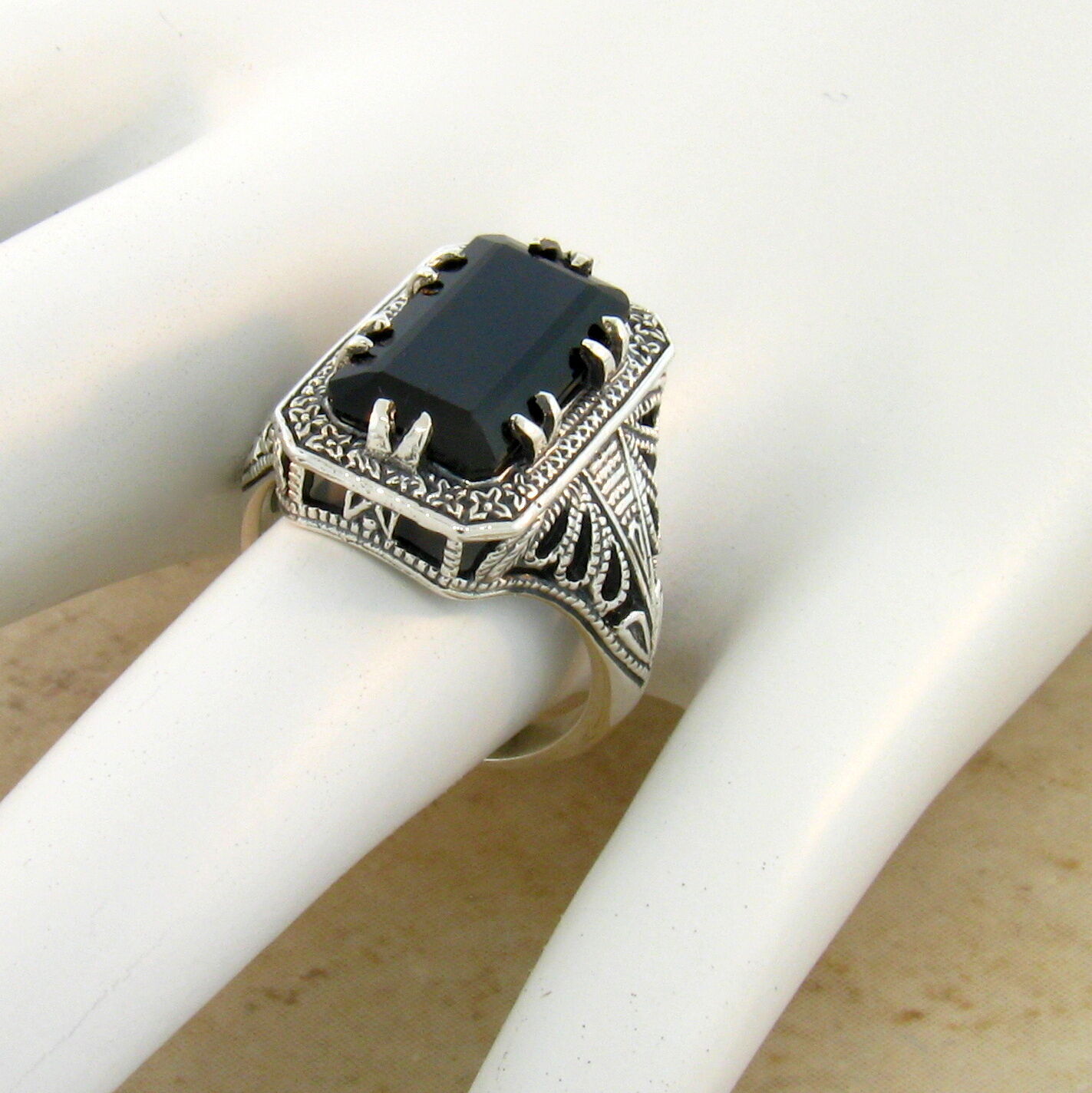 как выглядит BLACK AGATE 925 SOLID STERLING SILVER DECO ANTIQUE STYLE RING SIZE 6.75 765 фото