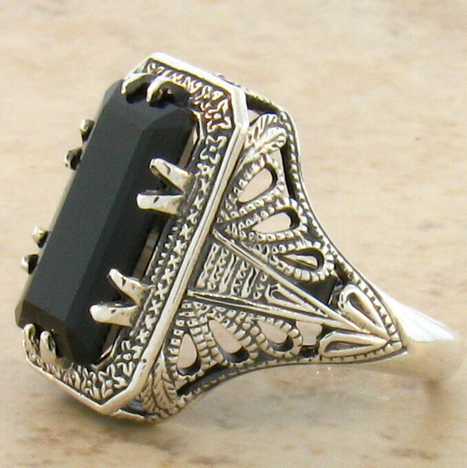 BLACK AGATE 925 SOLID STERLING SILVER DECO ANTIQUE STYLE RING SIZE 6.75 765