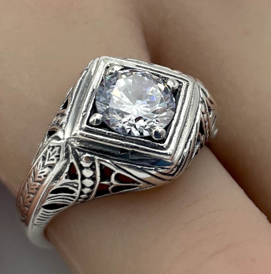 как выглядит ART DECO STYLE 925 STERLING SILVER SOLITAIRE FILIGREE CUBIC ZIRCONIA RING 1053X фото