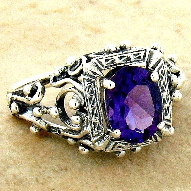 GENUINE AMETHYST VINTAGE STYLE 925 SOLID STERLING SILVER FILIGREE RING 267z