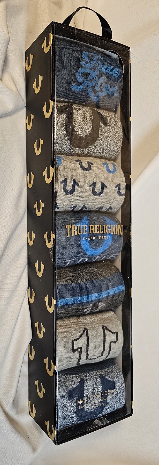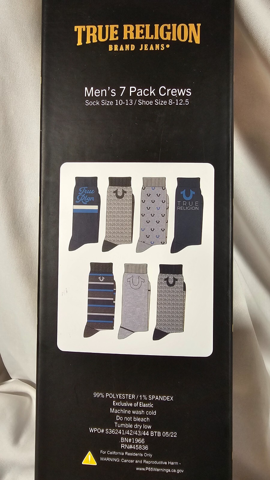True Religion 7 Pack Crew Socks, Asst Blue, Gray Logo Prints Gift Box SHIPS FREE