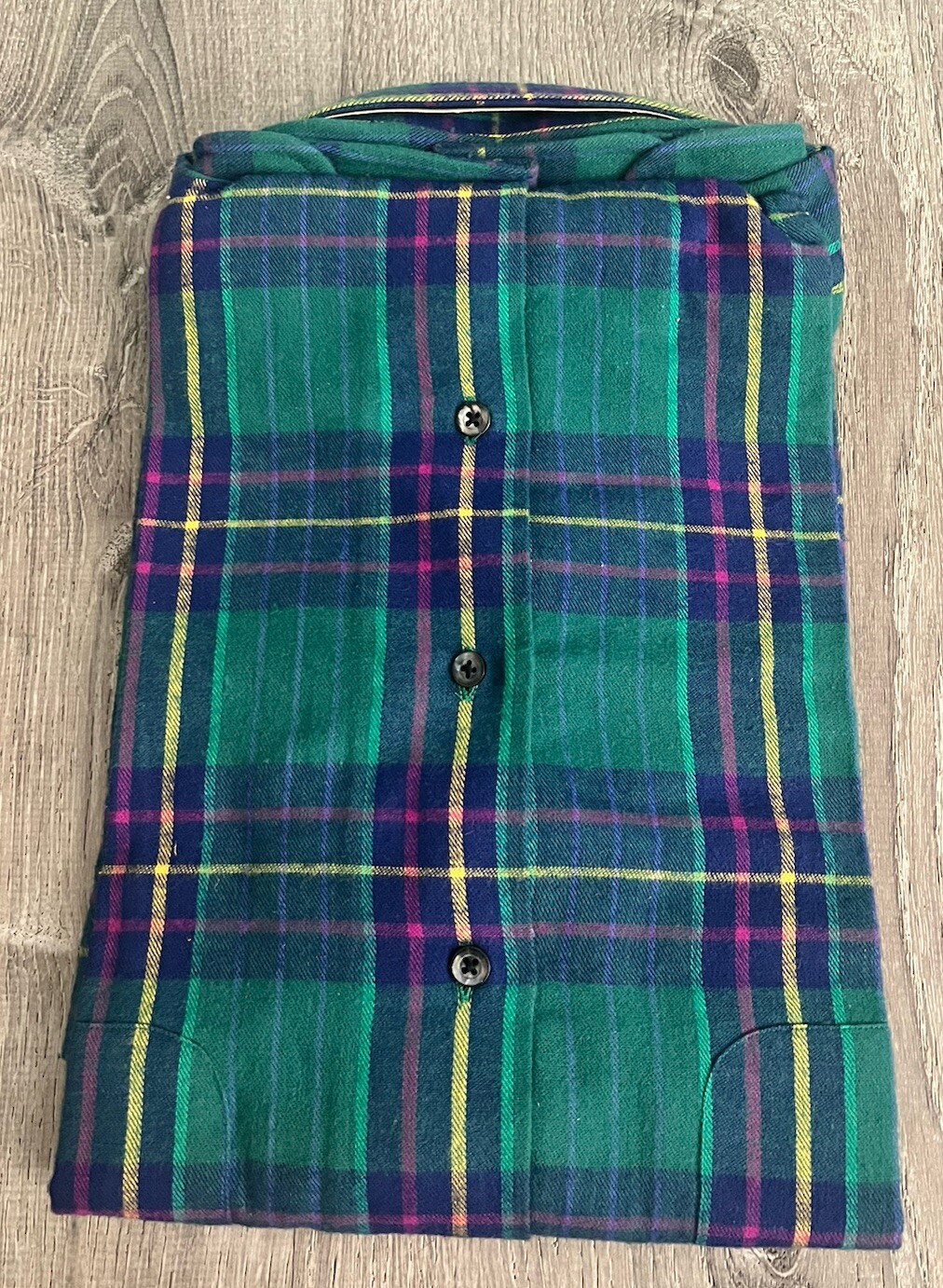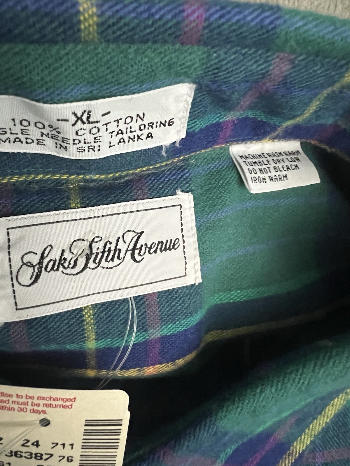 VTG Saks Fifth Avenue Mens Button Up Shirt Green Plaid 100 Cotton Single Needle