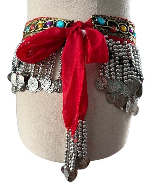 Belly Dance Red Hip Scarf Colorful Gems Silver Coins and Bead Chiffon Wrap Skirt