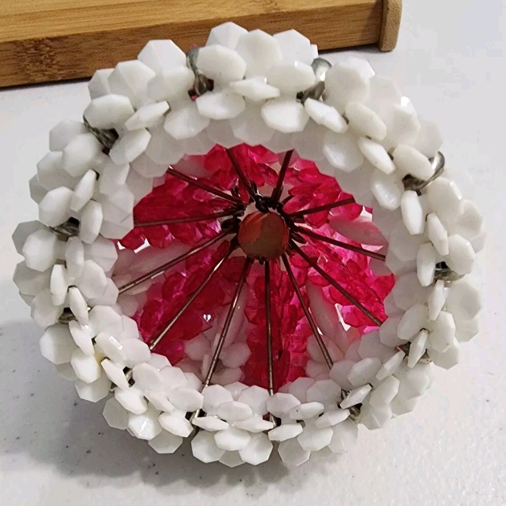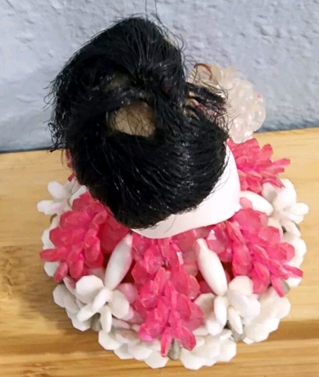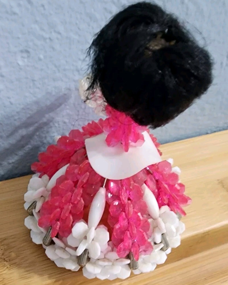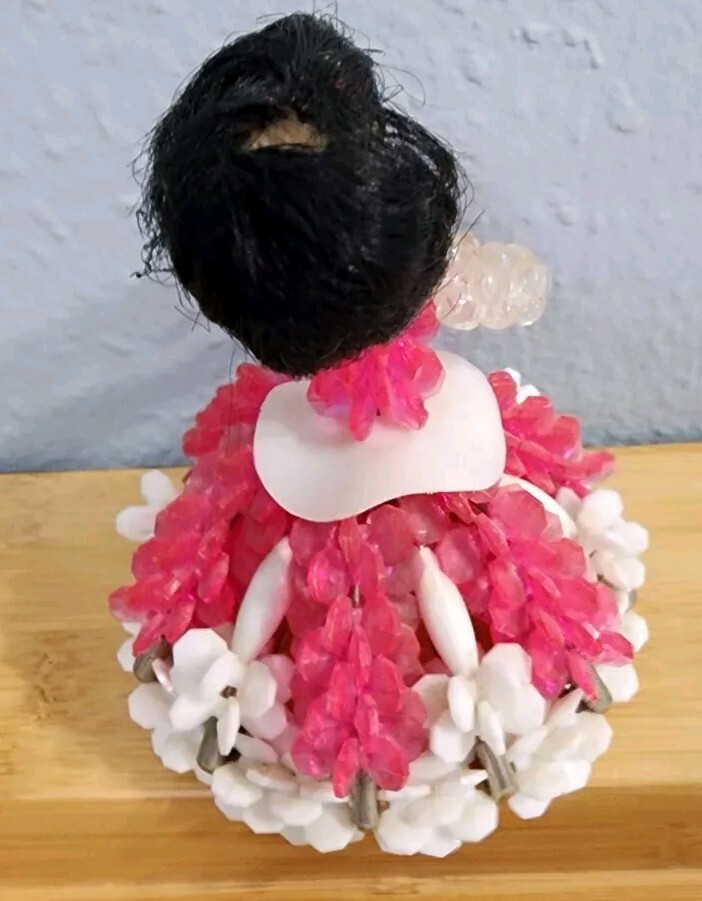 Vintage Kitschy Safety Pin Beads Doll Figurine Black Hair Pink White Dress 4