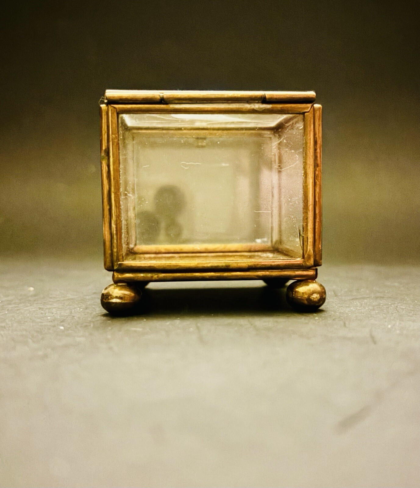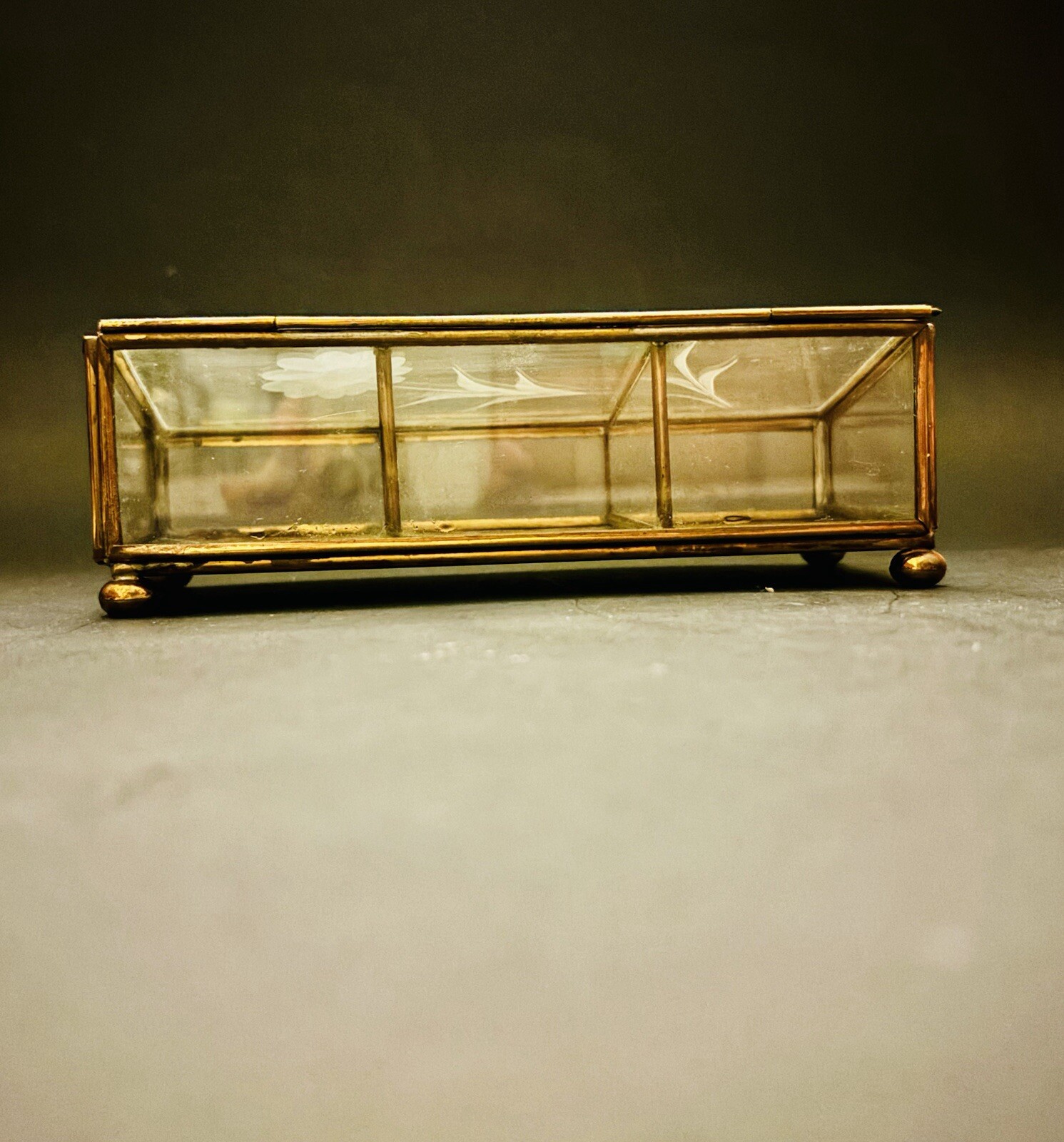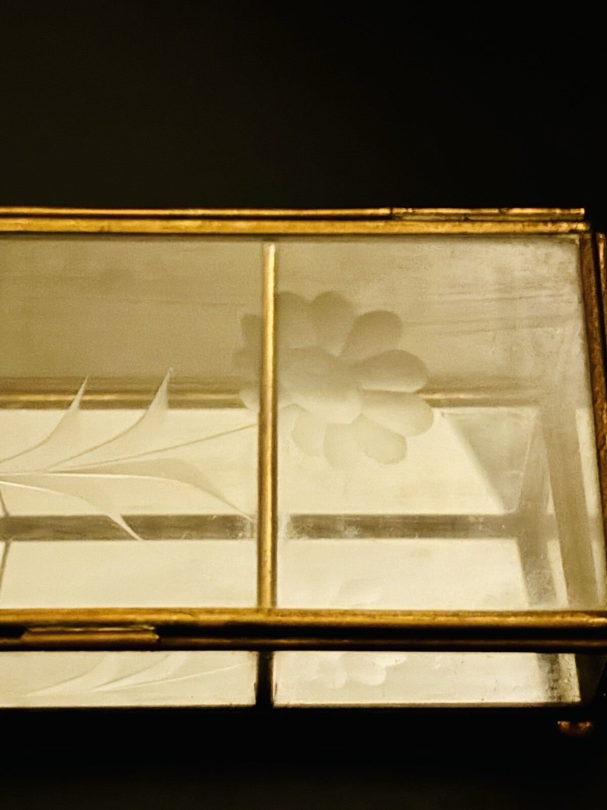 • 2 Vintage Brass Glass Trinket Jewelry Boxes Mirrored Bottom Etched Bird Flower