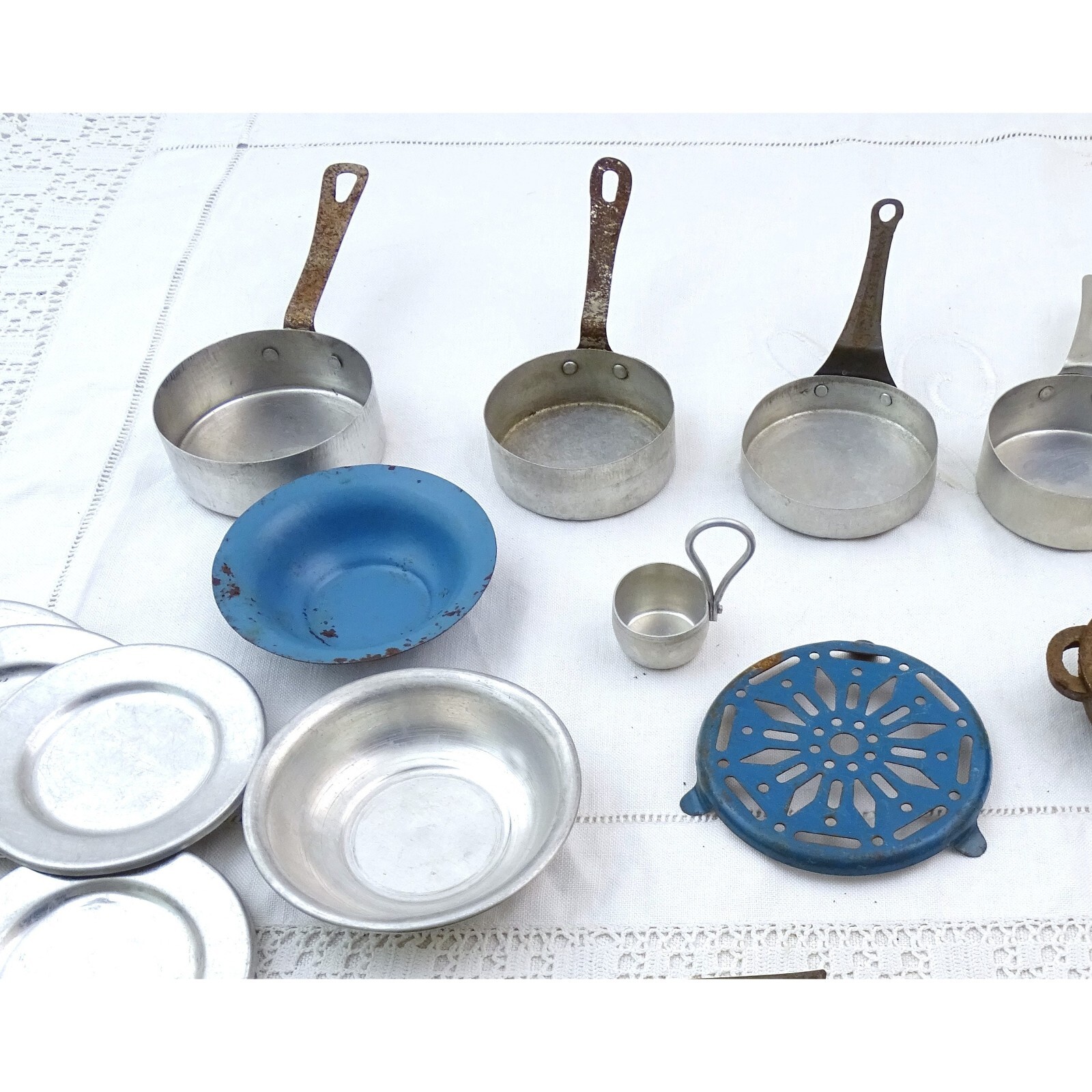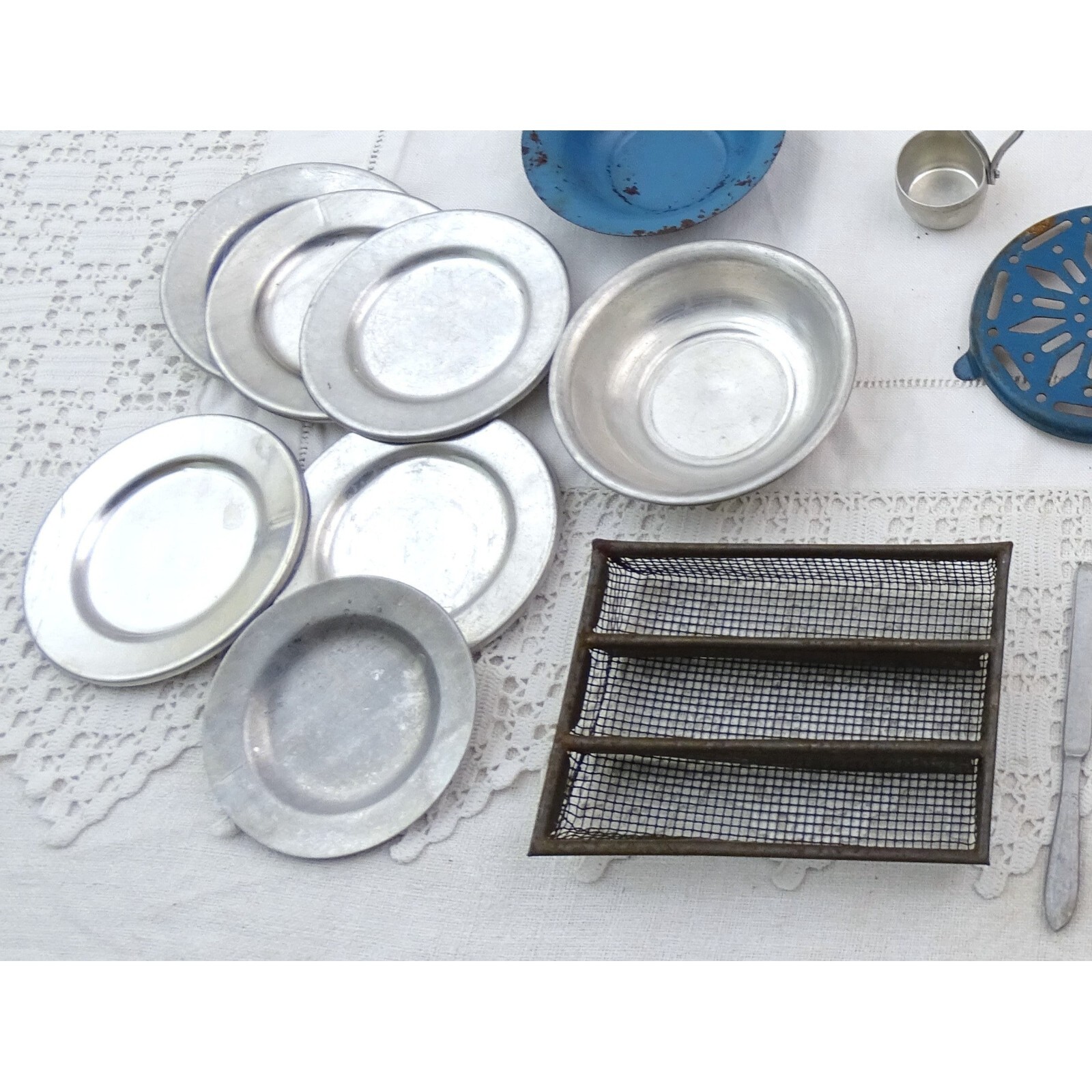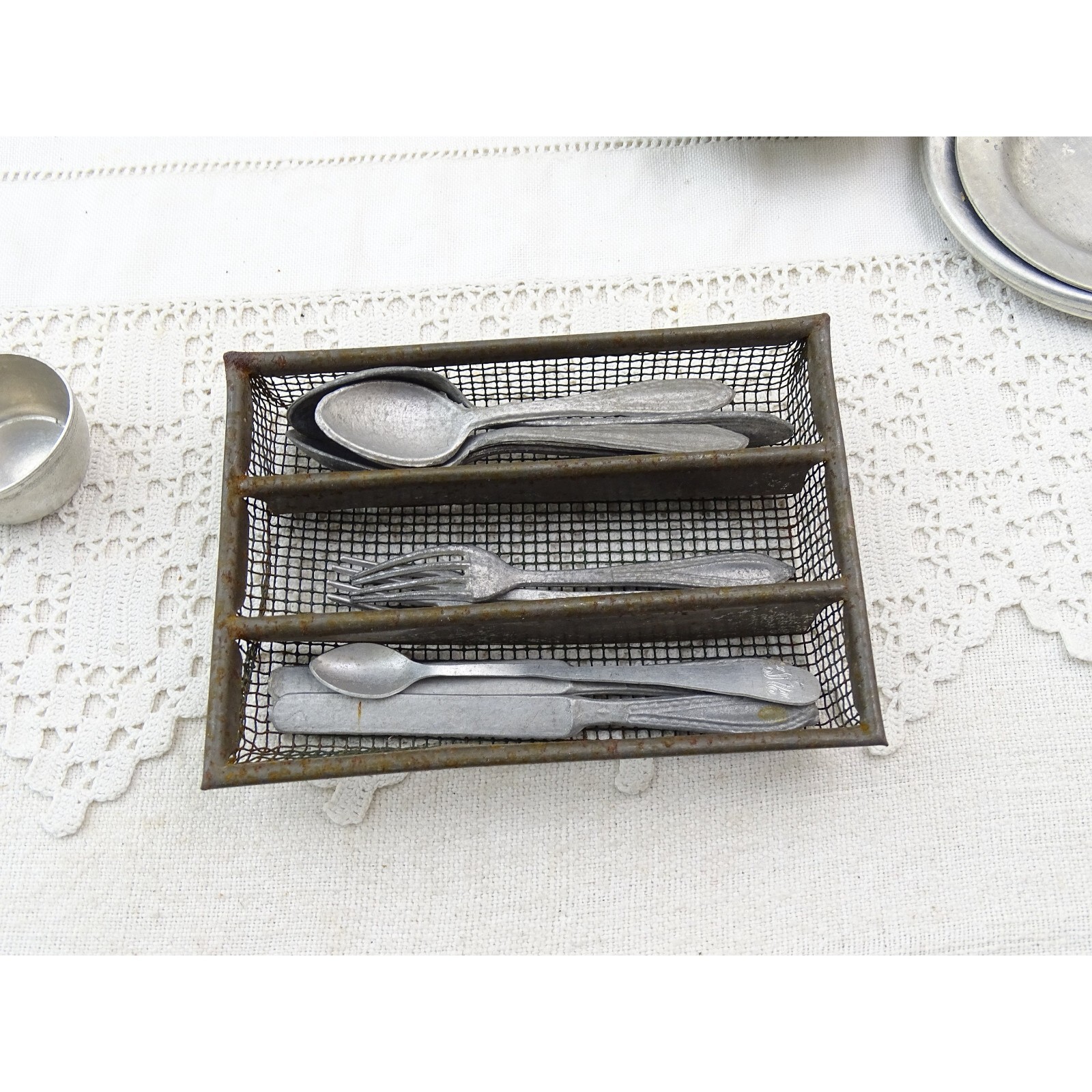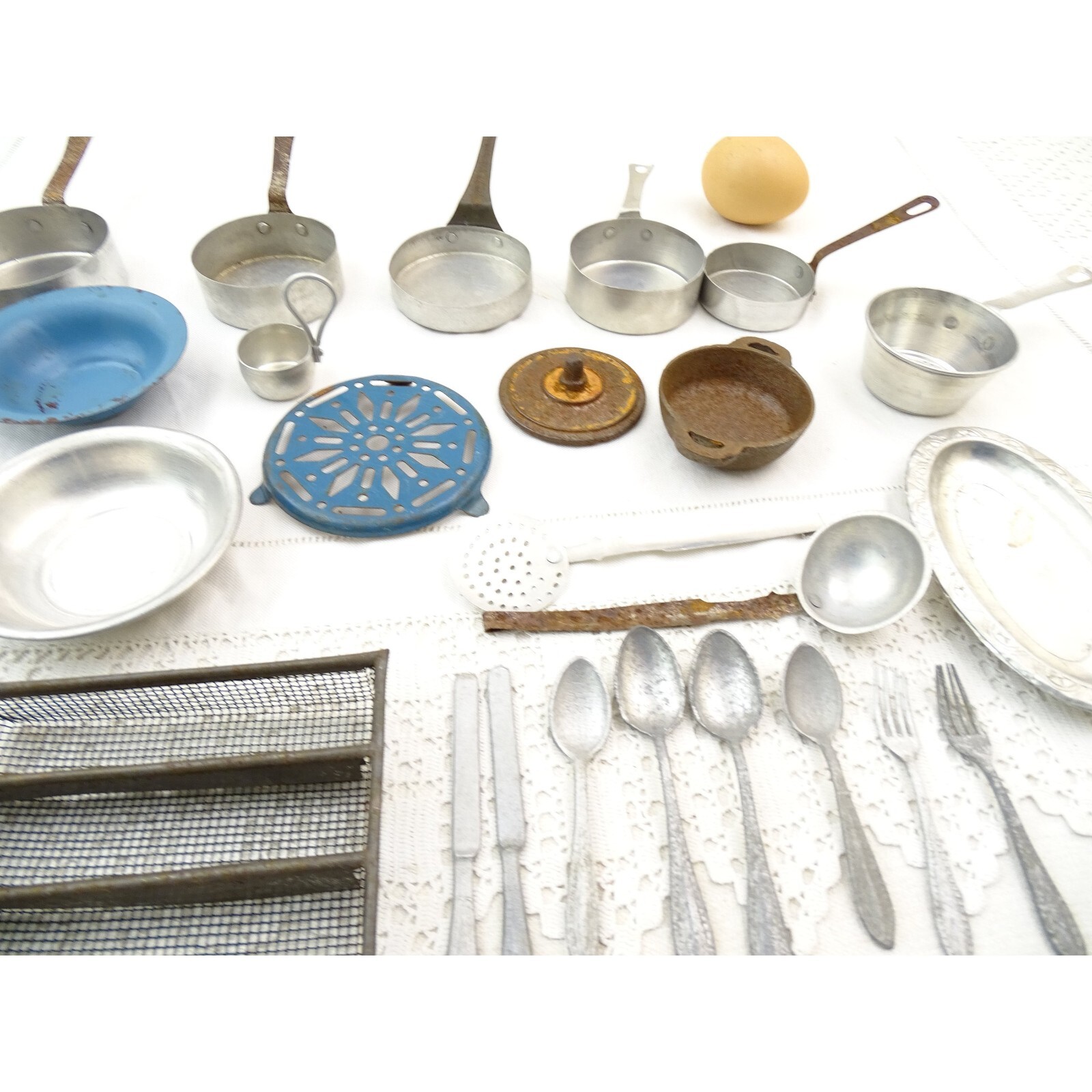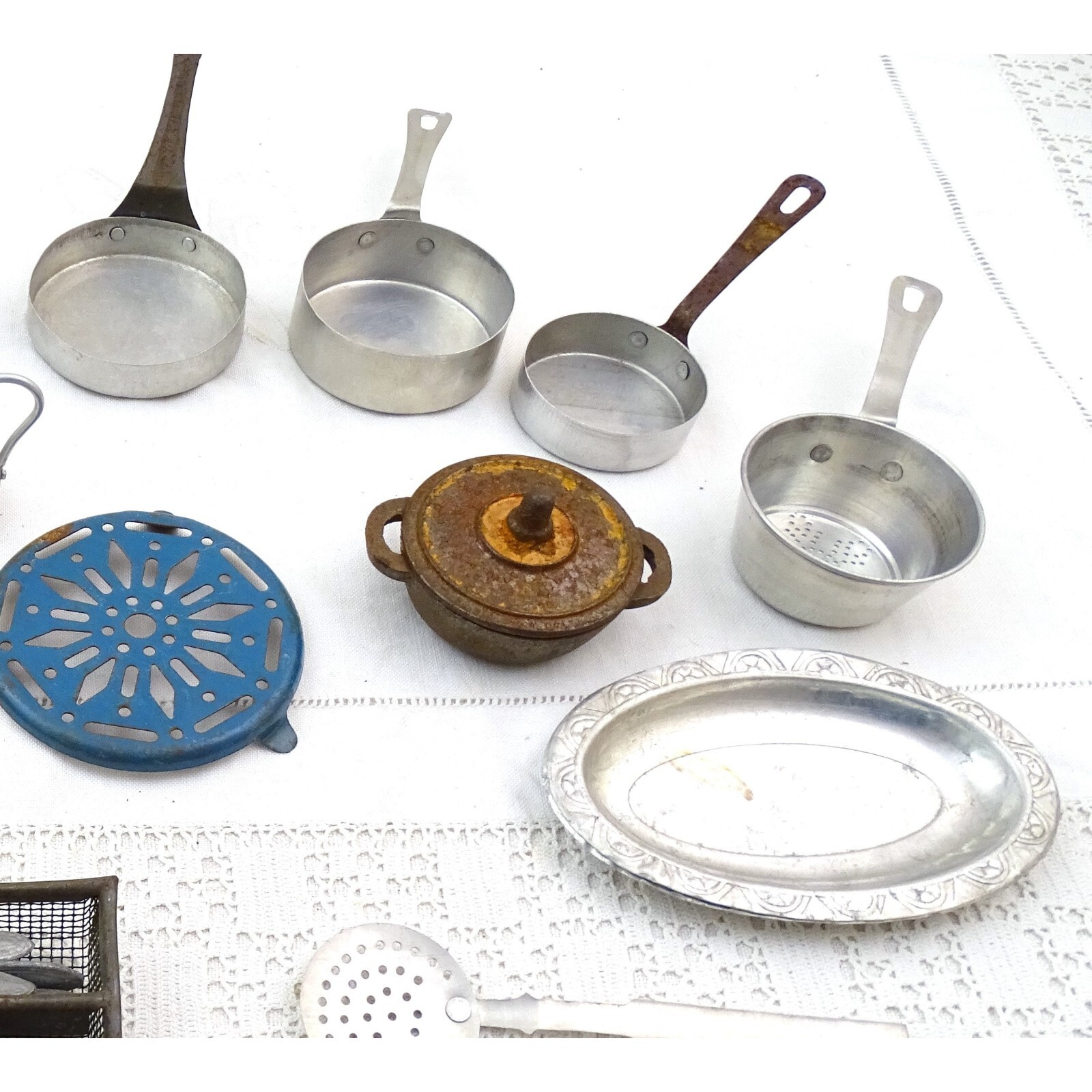 VTG French Dolls Play Dinner Set with Enamel Trivet, Cutlery Cast Iron Casserole