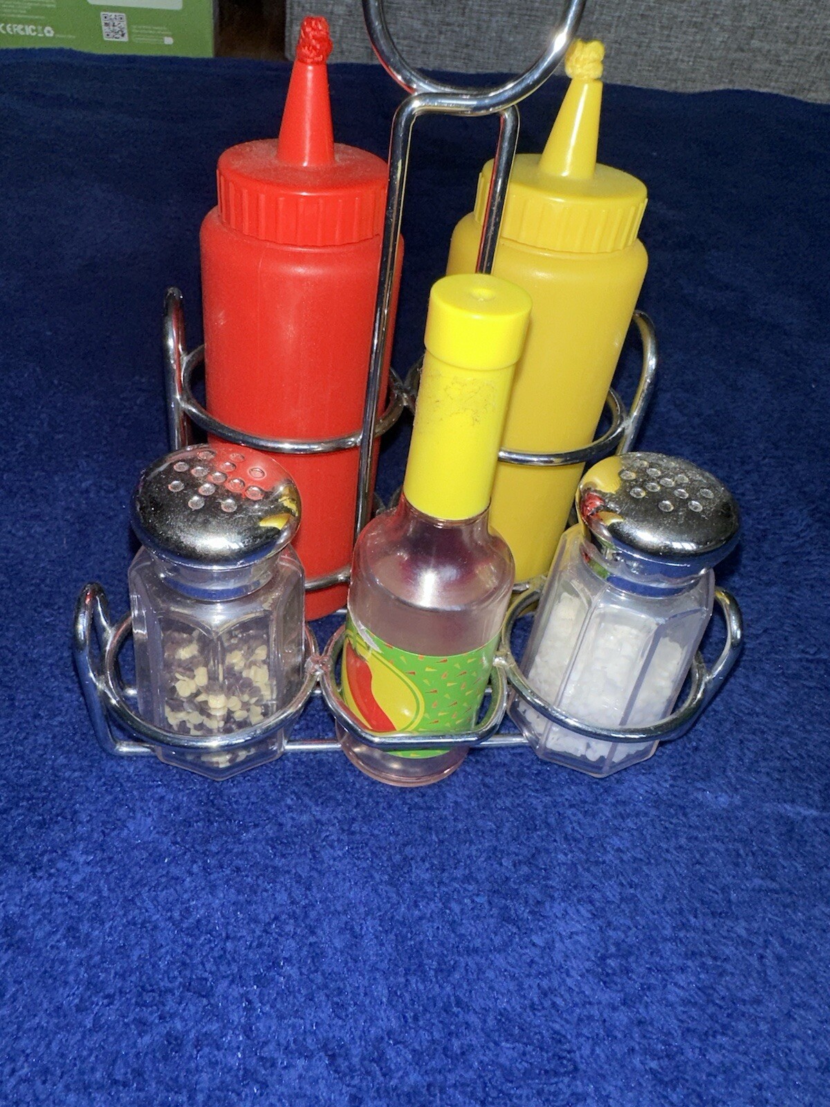 Melissa Doug Pretend Play Food Condiment Set Caddy Salt Pepper Ketchup Set