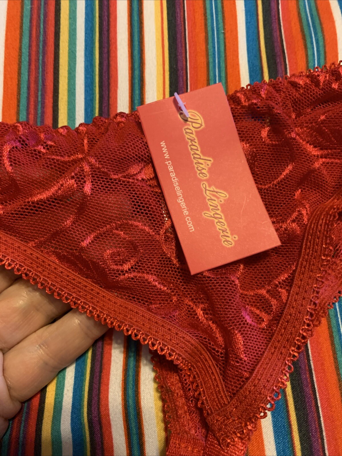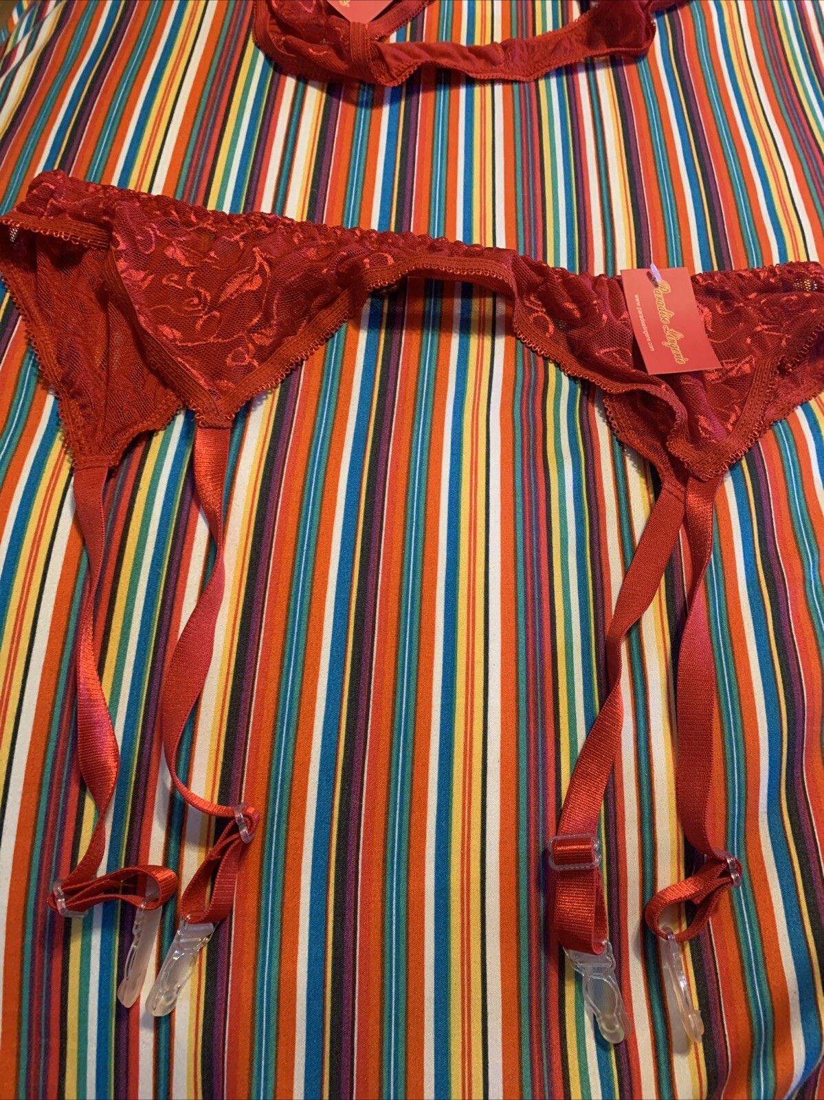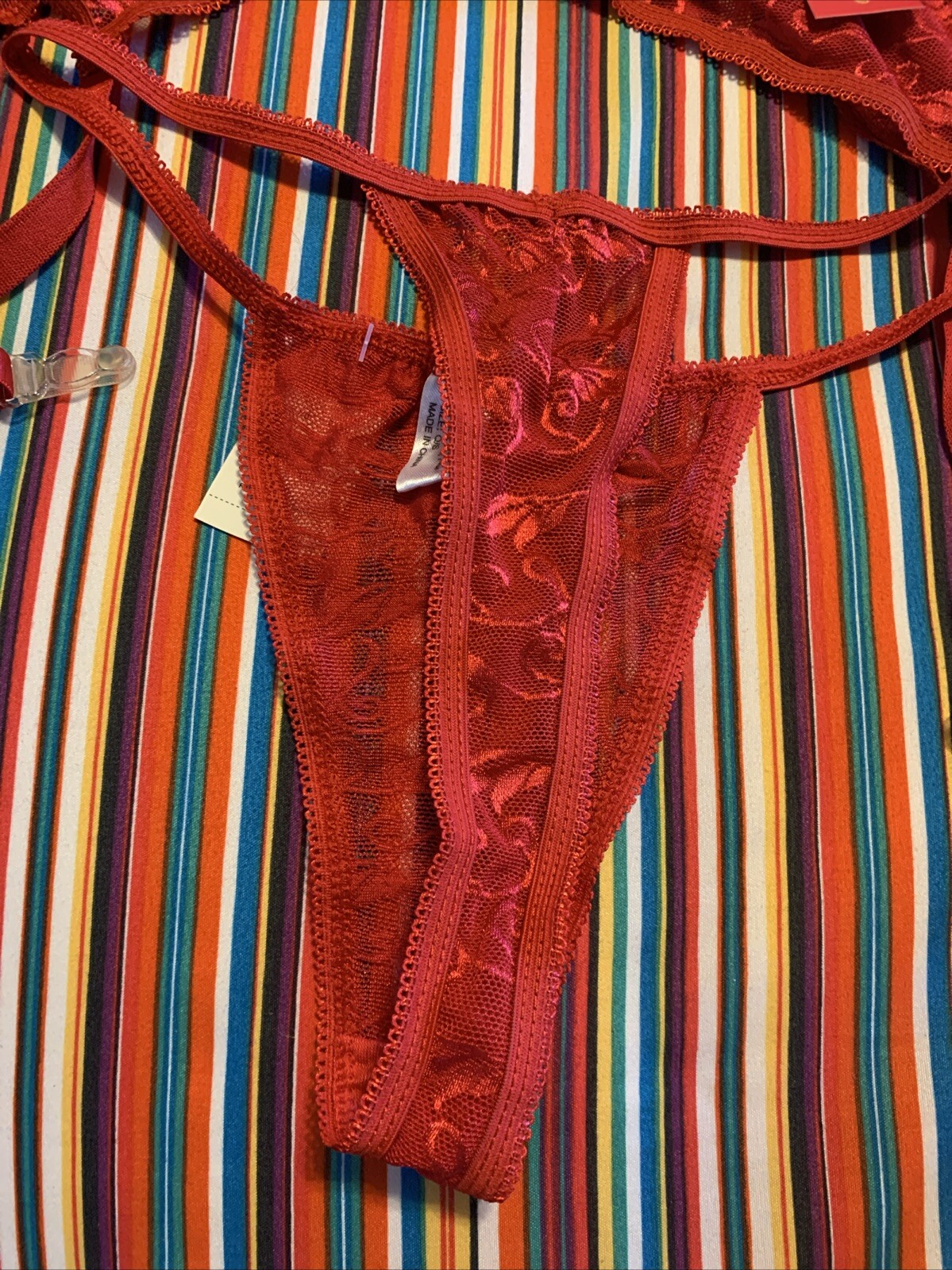 как выглядит NOS Vtg Paradise Lingerie 2pc STRING Bikini PANTY GARTER Belt SET Red Lace OS фото