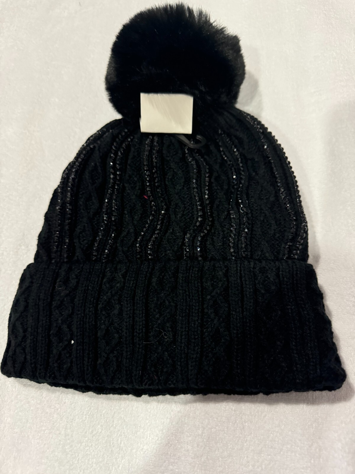 как выглядит Women faux fur removable pom pom Beanie Hat Black with Front Glitter фото