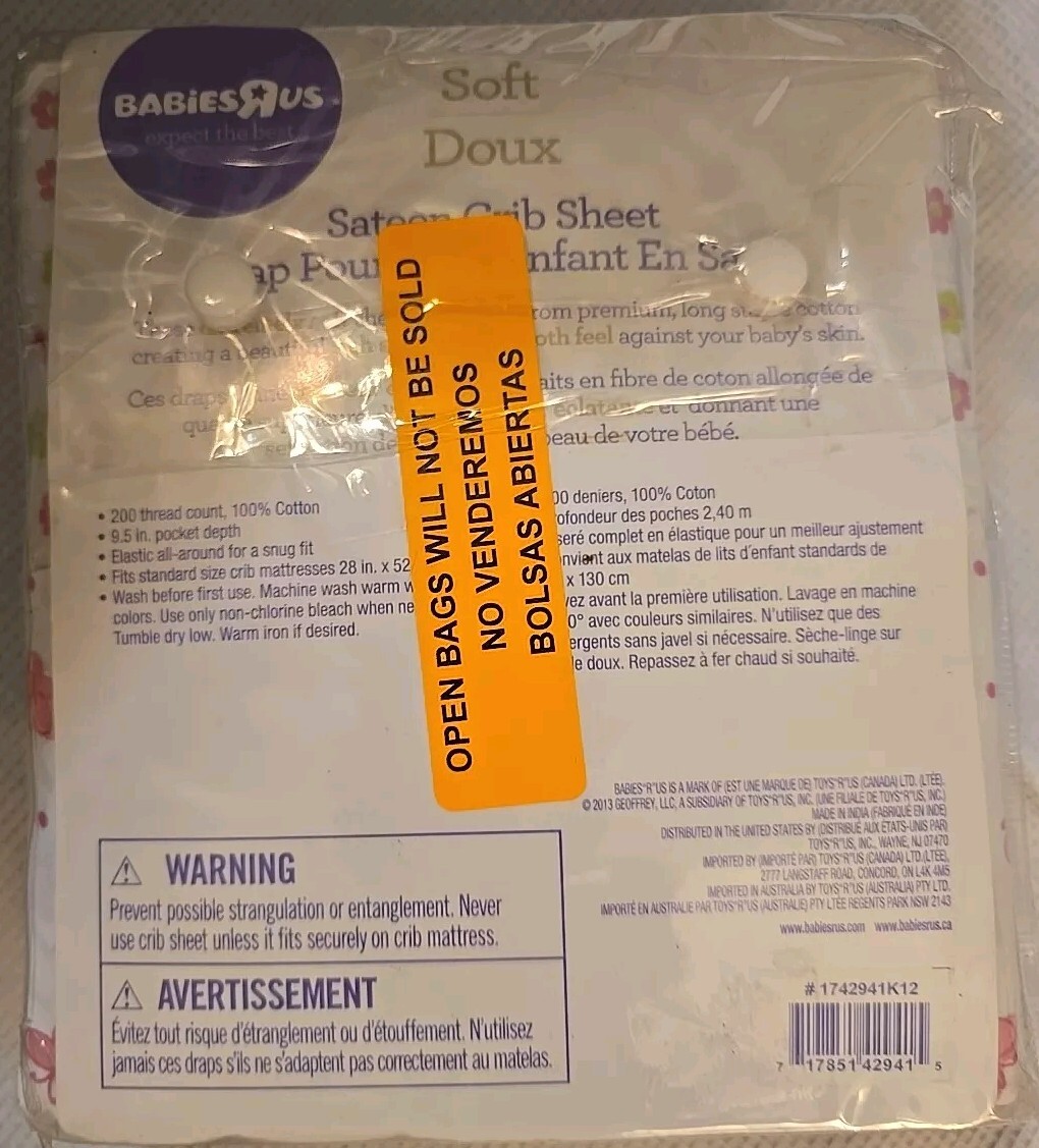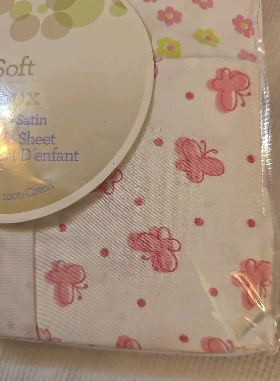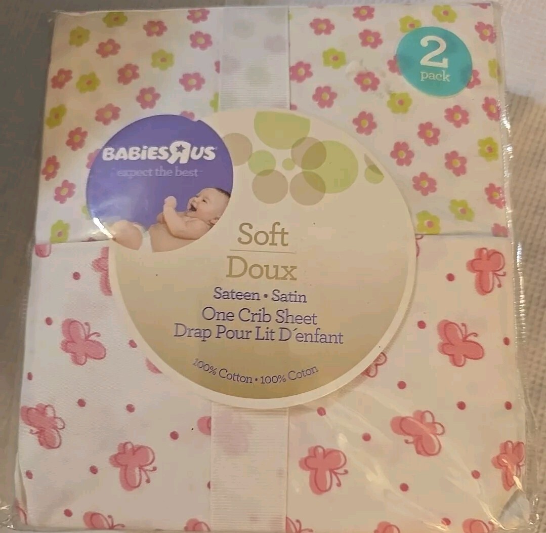Babies R Us 2 Pack Soft Doux Sateen Satin Crib Sheet Pink White Butterfly Flower