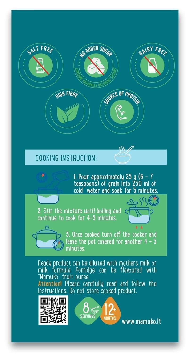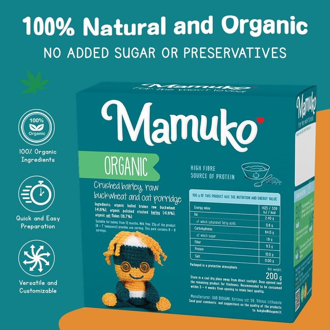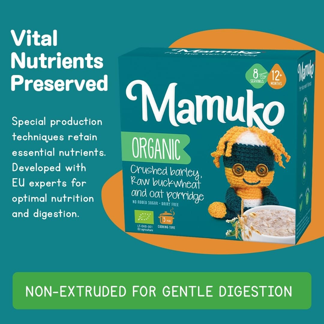 MAMUKO Baby Organic Porridge - Crushed Barley, Raw Buckwheat Oat 12M 200g