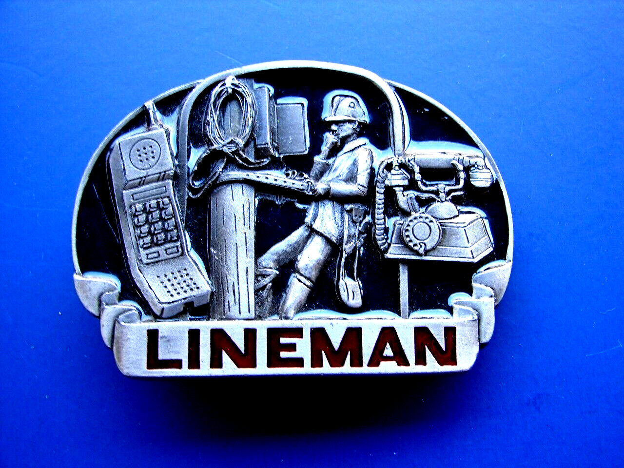 как выглядит Vtg 80s Great American Belt Buckle Telephone Lineman Pewter 1983 C J Inc фото