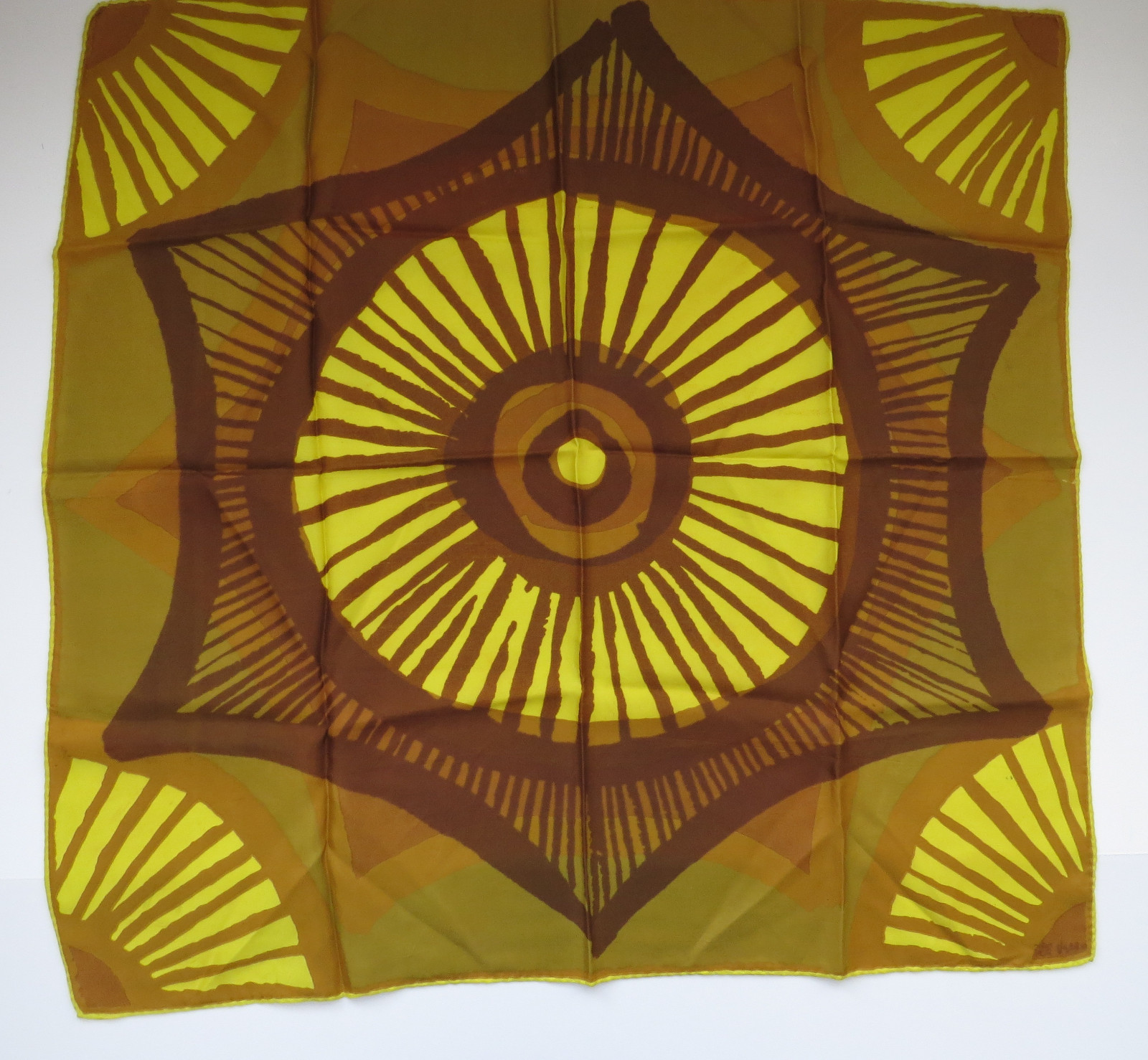 как выглядит 1960sVERA NEUMANN Square Scarf - Retro Brown Yellow Gold Geometric Sun Pattern фото