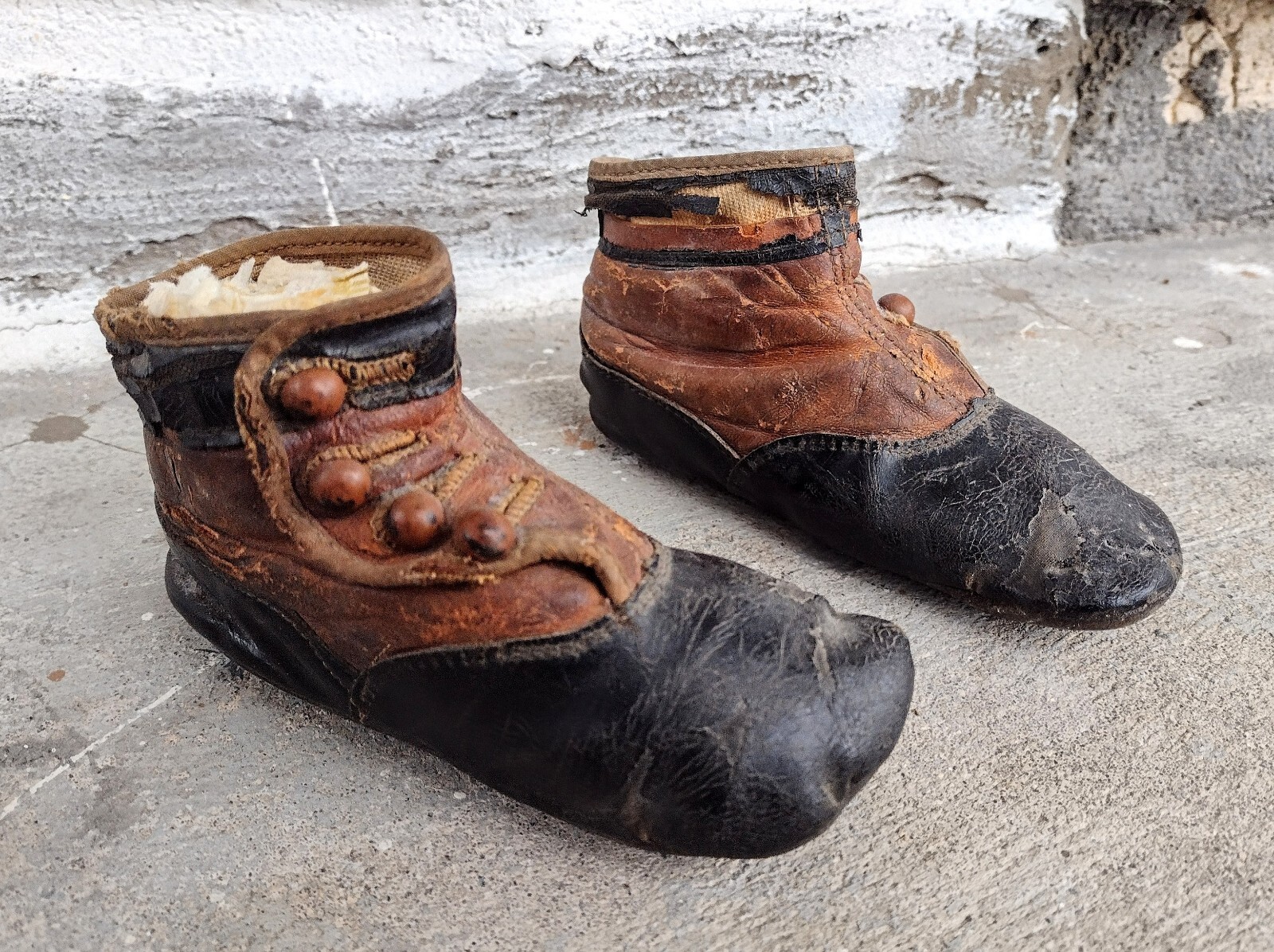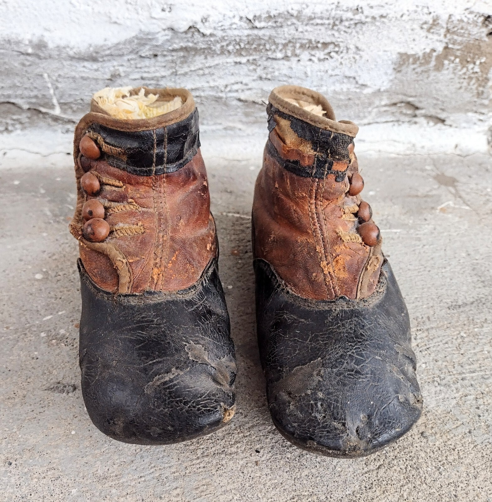 как выглядит Antique Victorian Two Tone Brown Black Leather High Top Button Up Baby Shoes фото