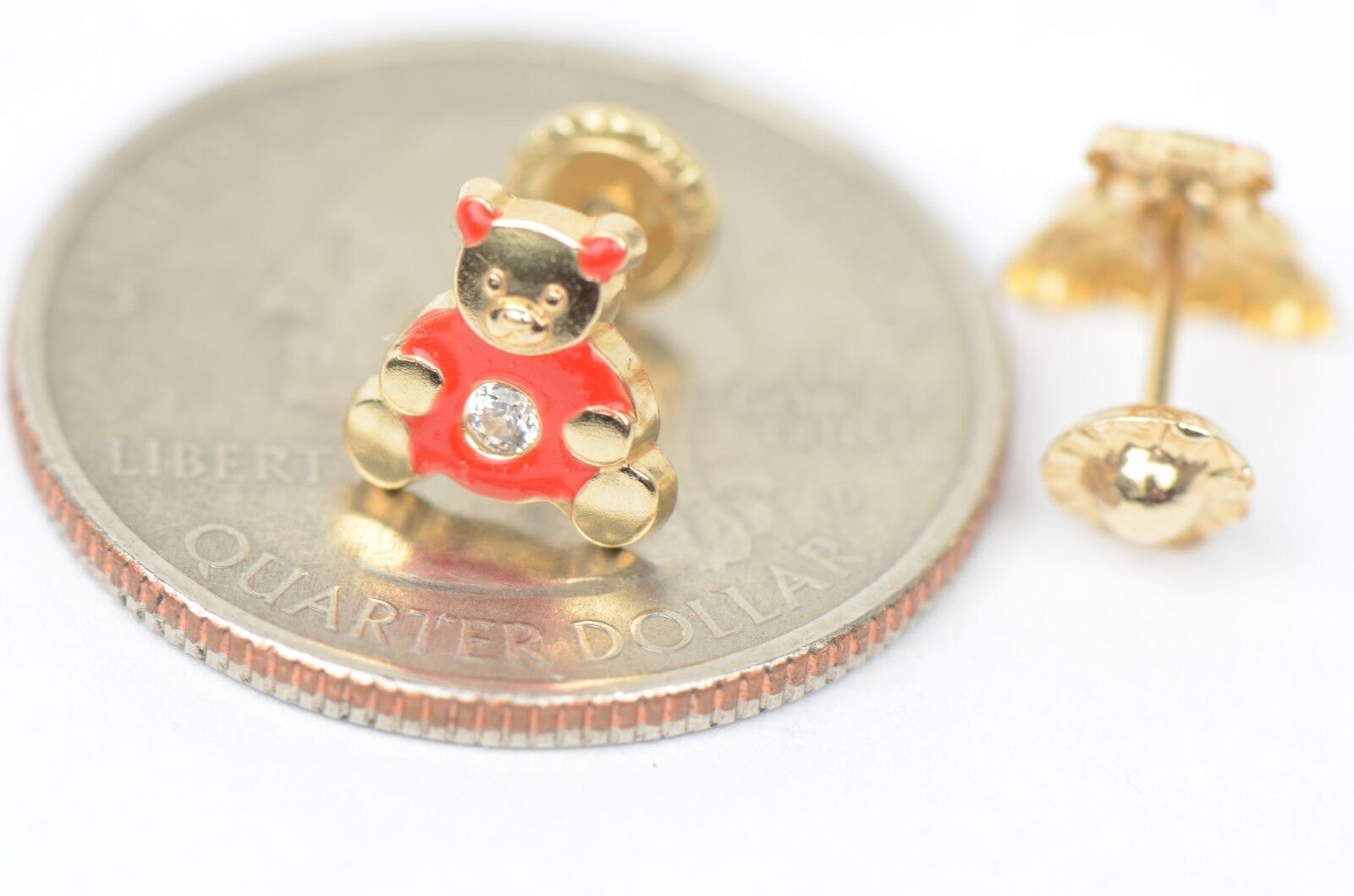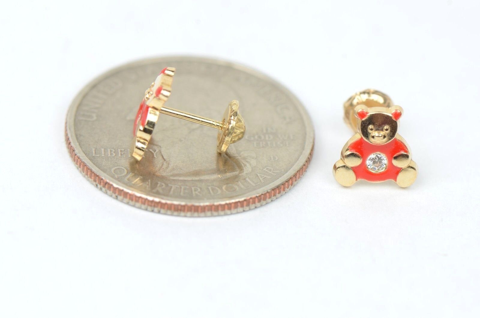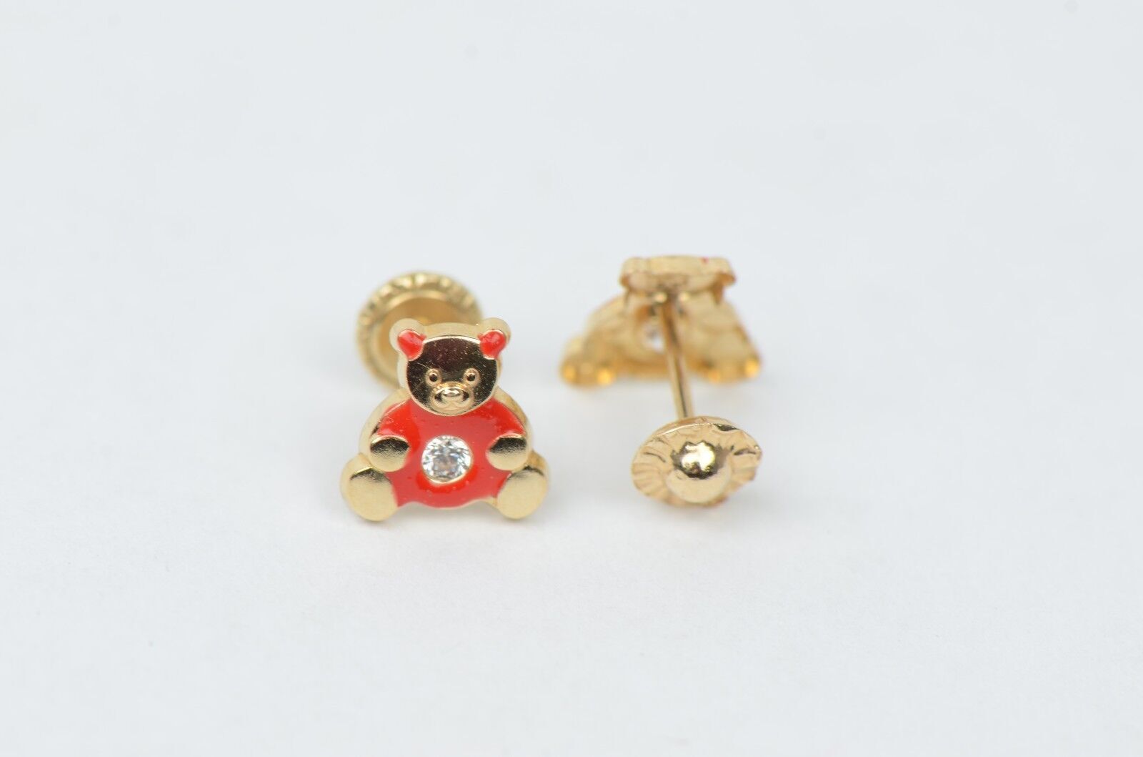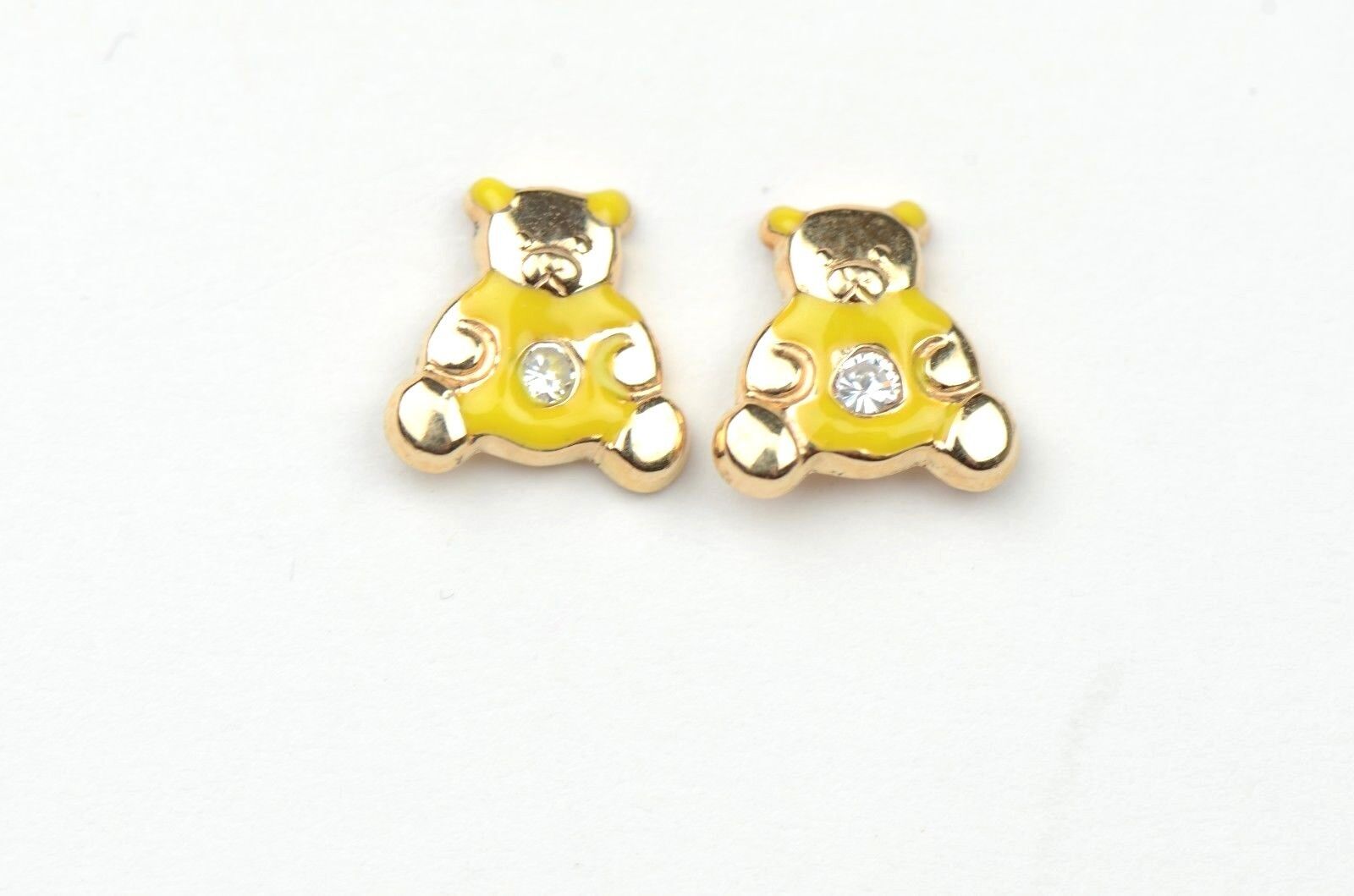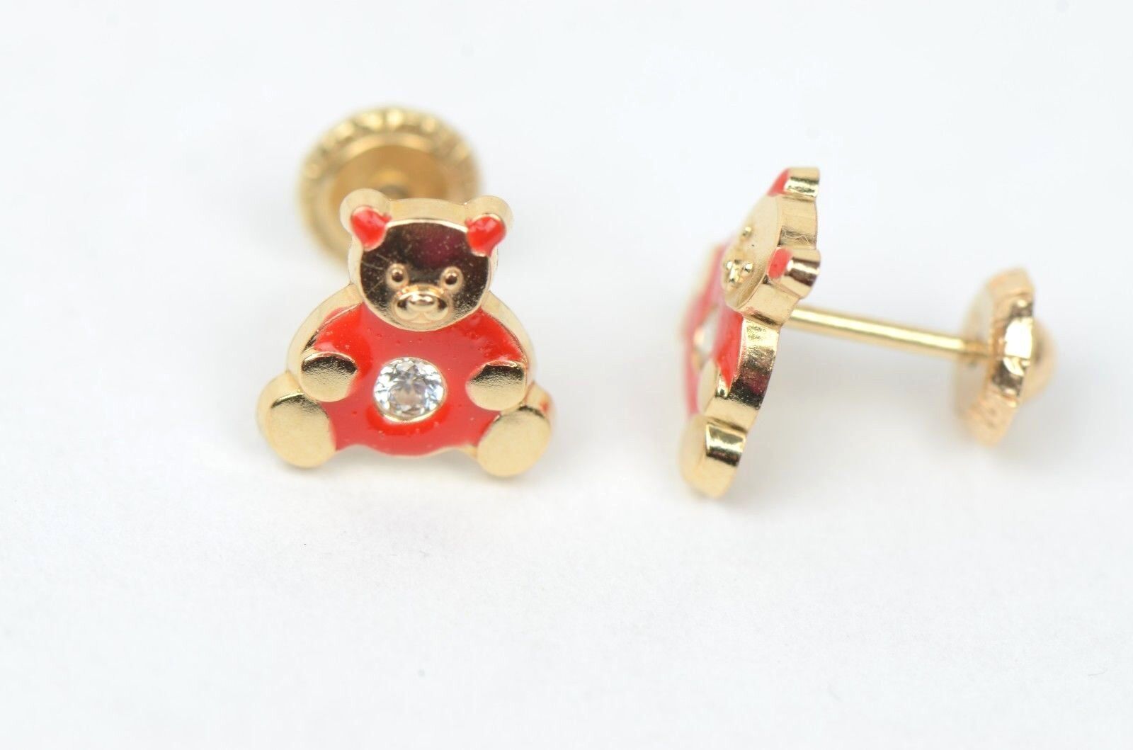14k Yellow Gold Baby Enamel CZ Teddy Bear earrings, Screw Back