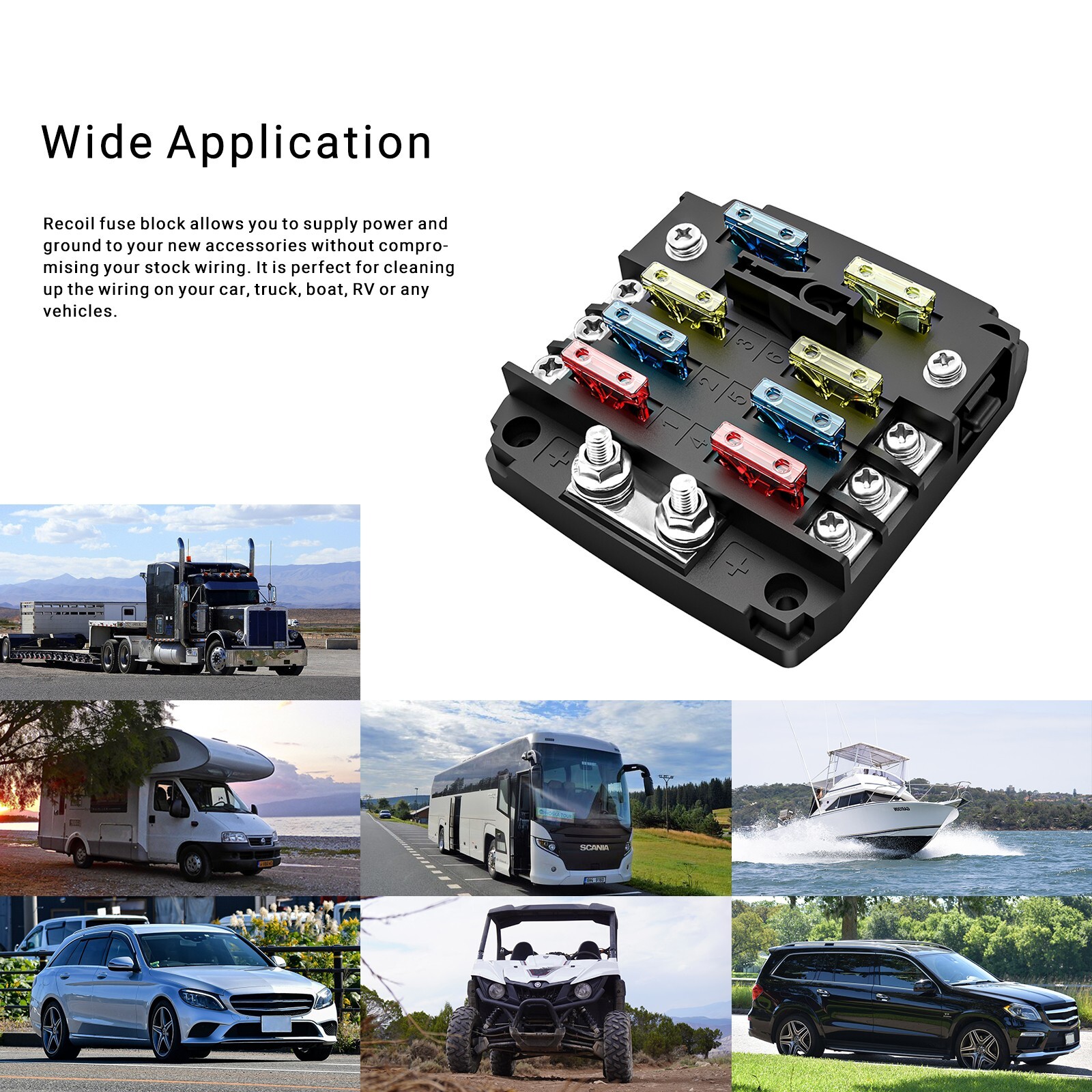 Recoil AF6 Fuse Box 6-Way ATC/ATO Fuse Block,Bolt Terminals, 12pcs Fuses, Screws