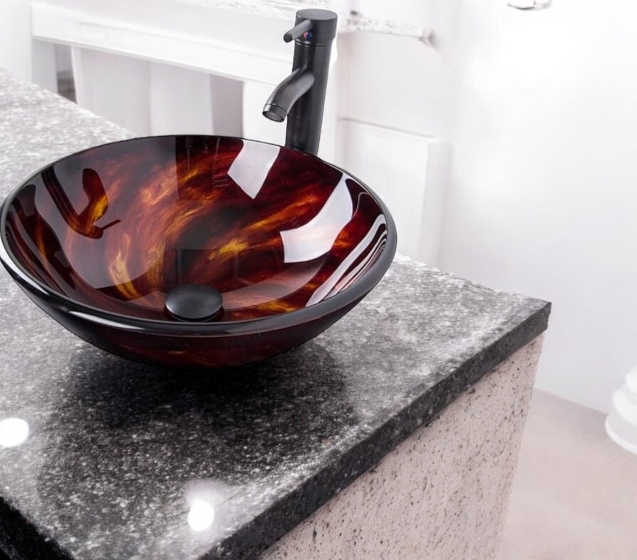 Bathroom Dark Bronze Vessel Sink Combo Tempered Glass Faucet Pop up Drain Combo