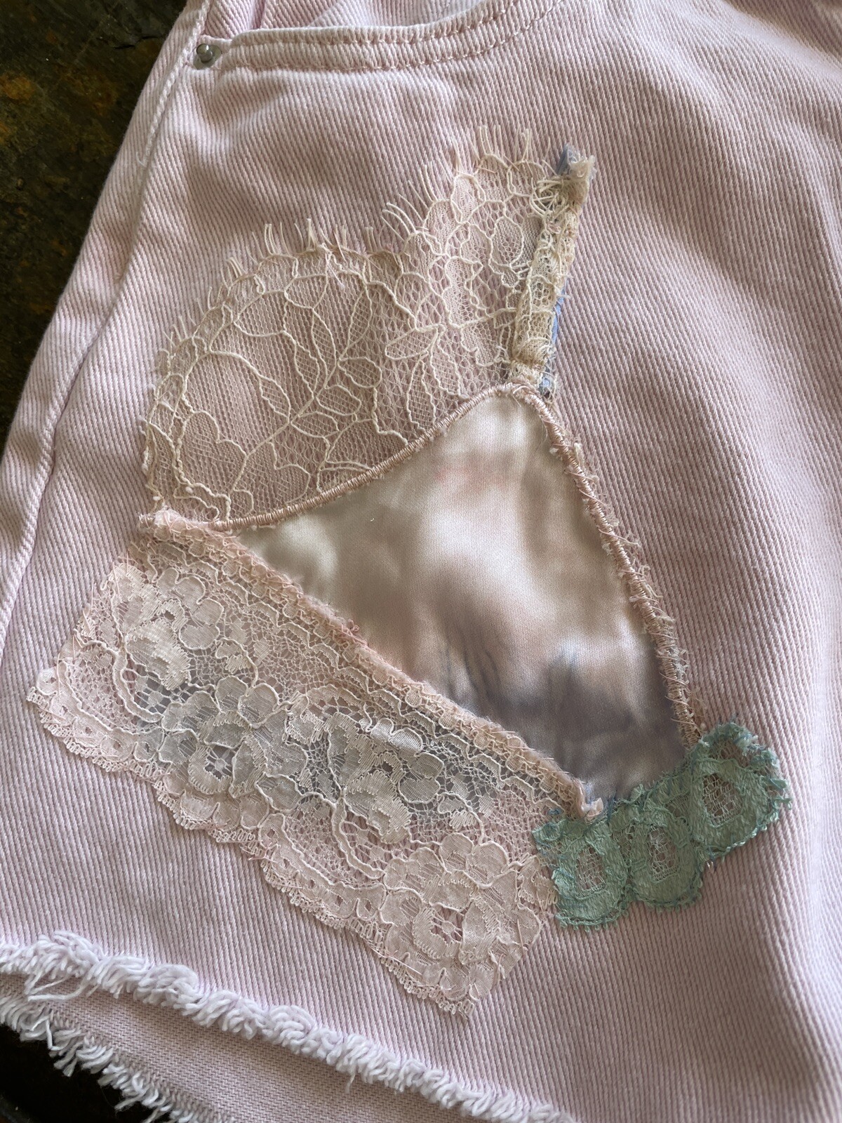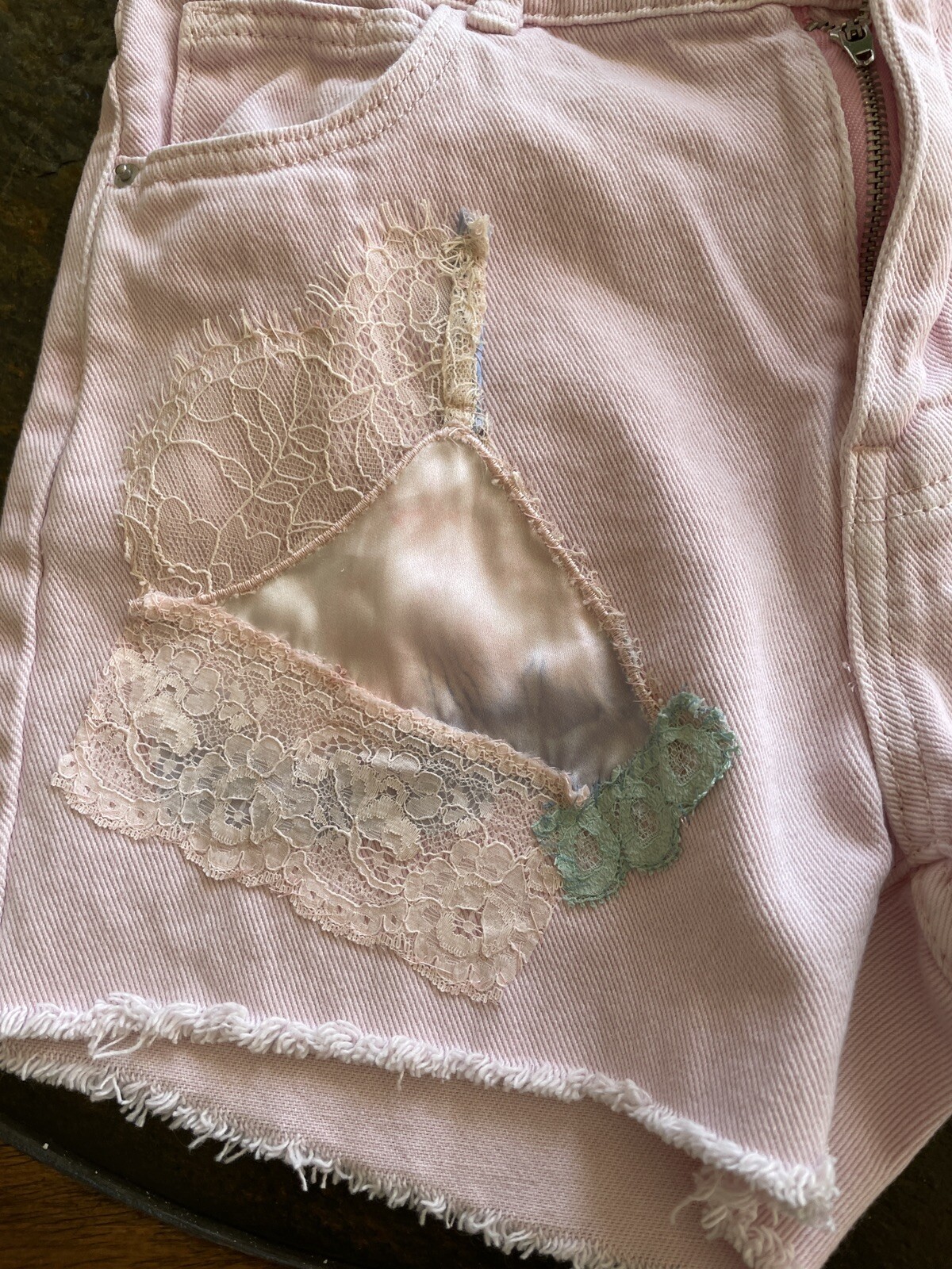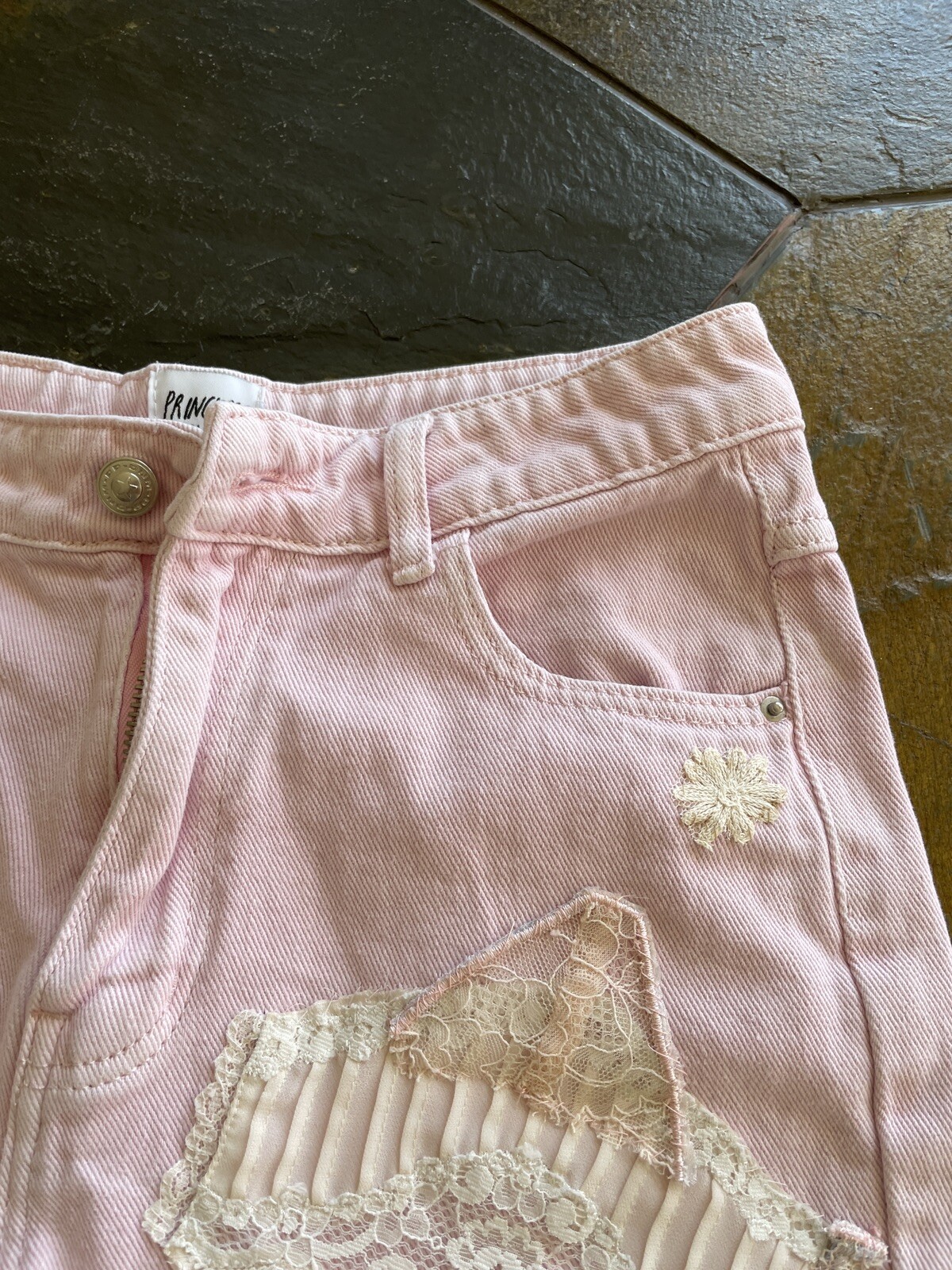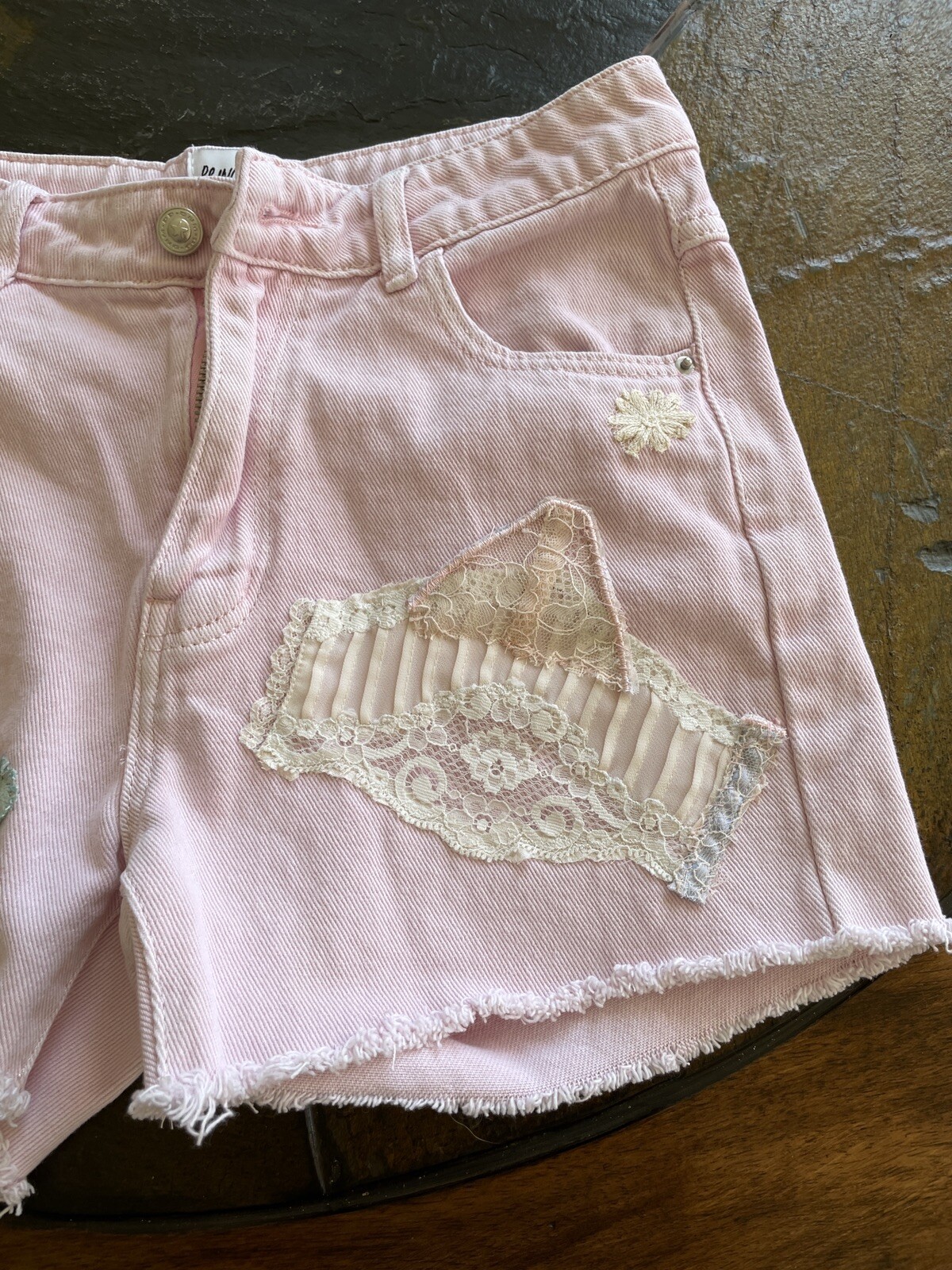 Poly Princess Pink ReLoved Cotton Denim Vintage Lace Embellishment Shorts S