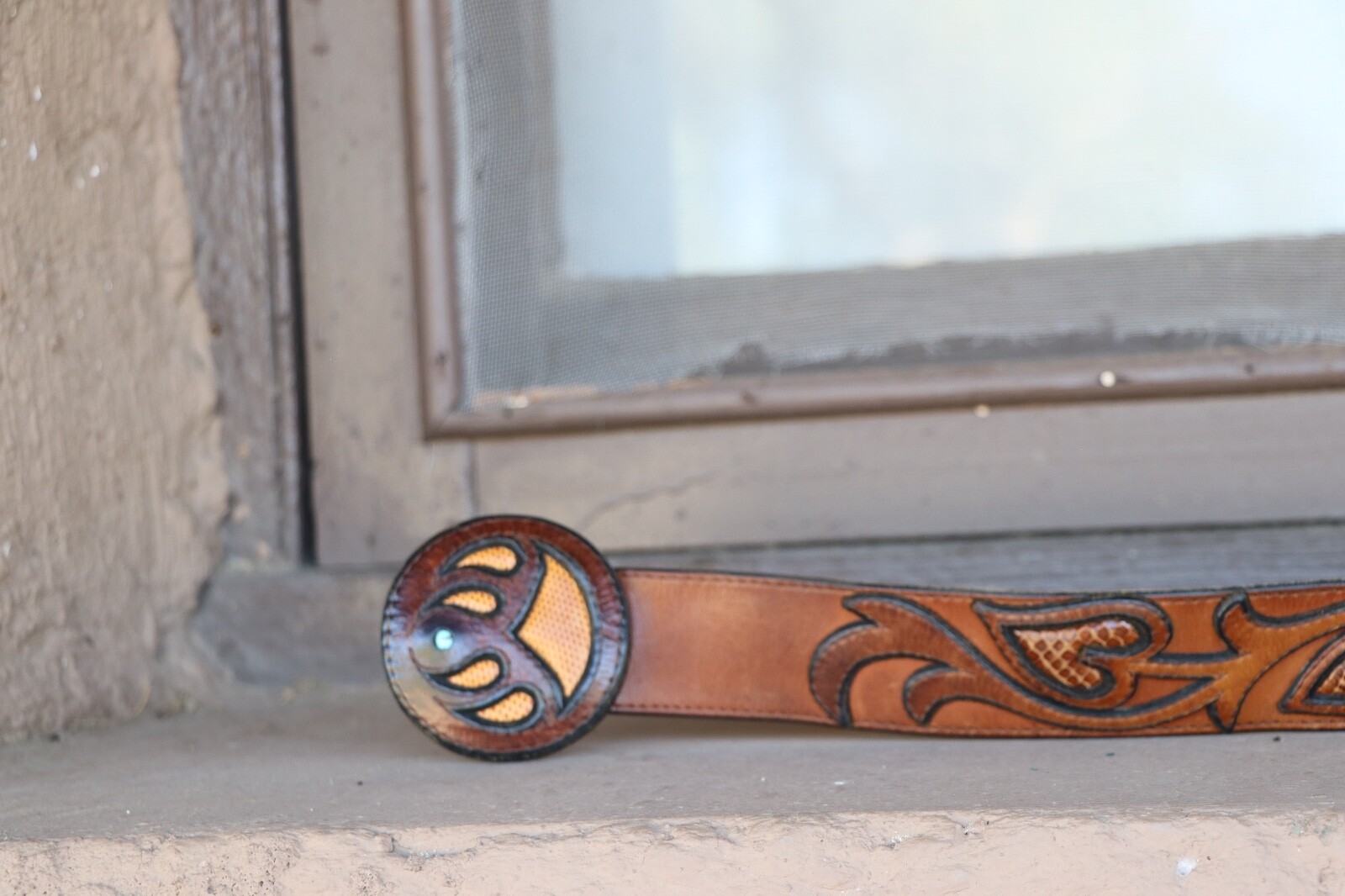 RARE 70s Vintage WYLY's Brown Leather Buckle Belt w/ Genuine Turquoise