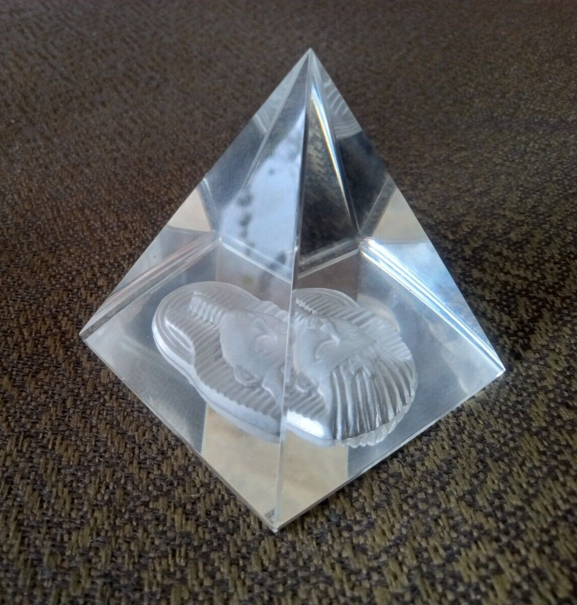 как выглядит 3 Crystal Pyramid Prisms Engraved With Image of KING TUT - 3 Sizes Boxed. фото