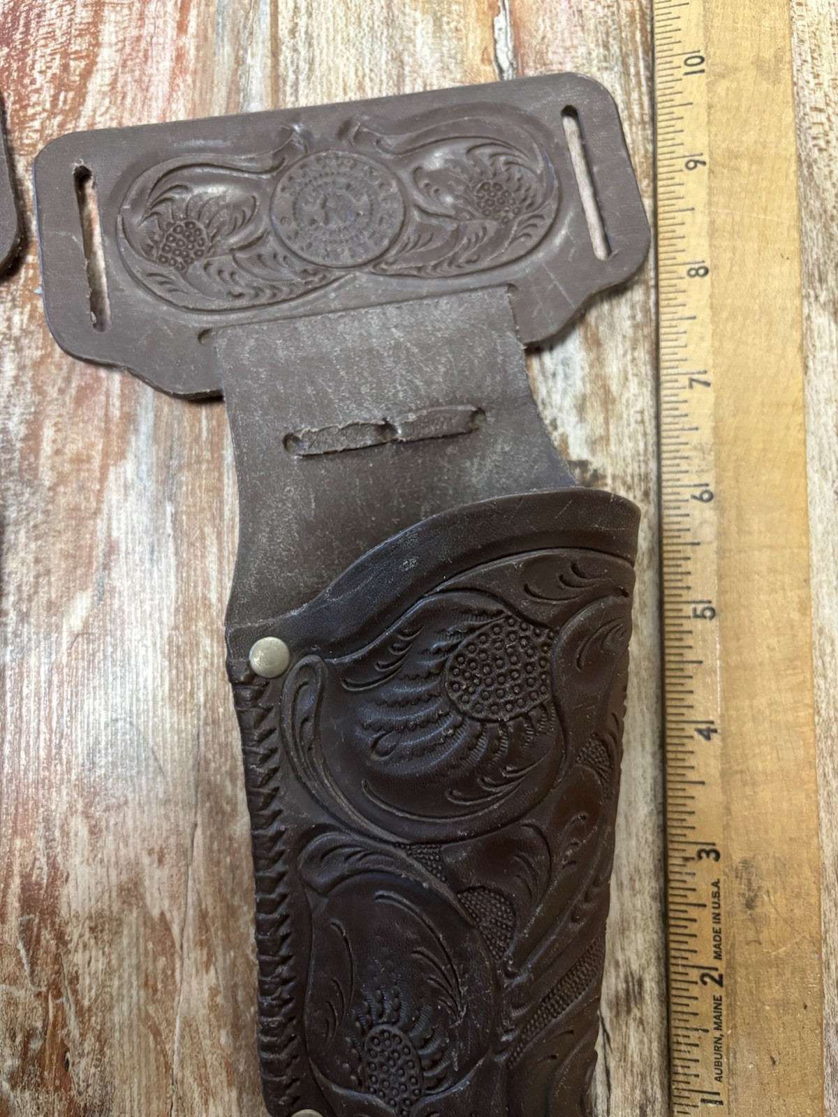2 Mattel Fanner Cap Gun Holsters Faux Brown Tooled Leather Plastic