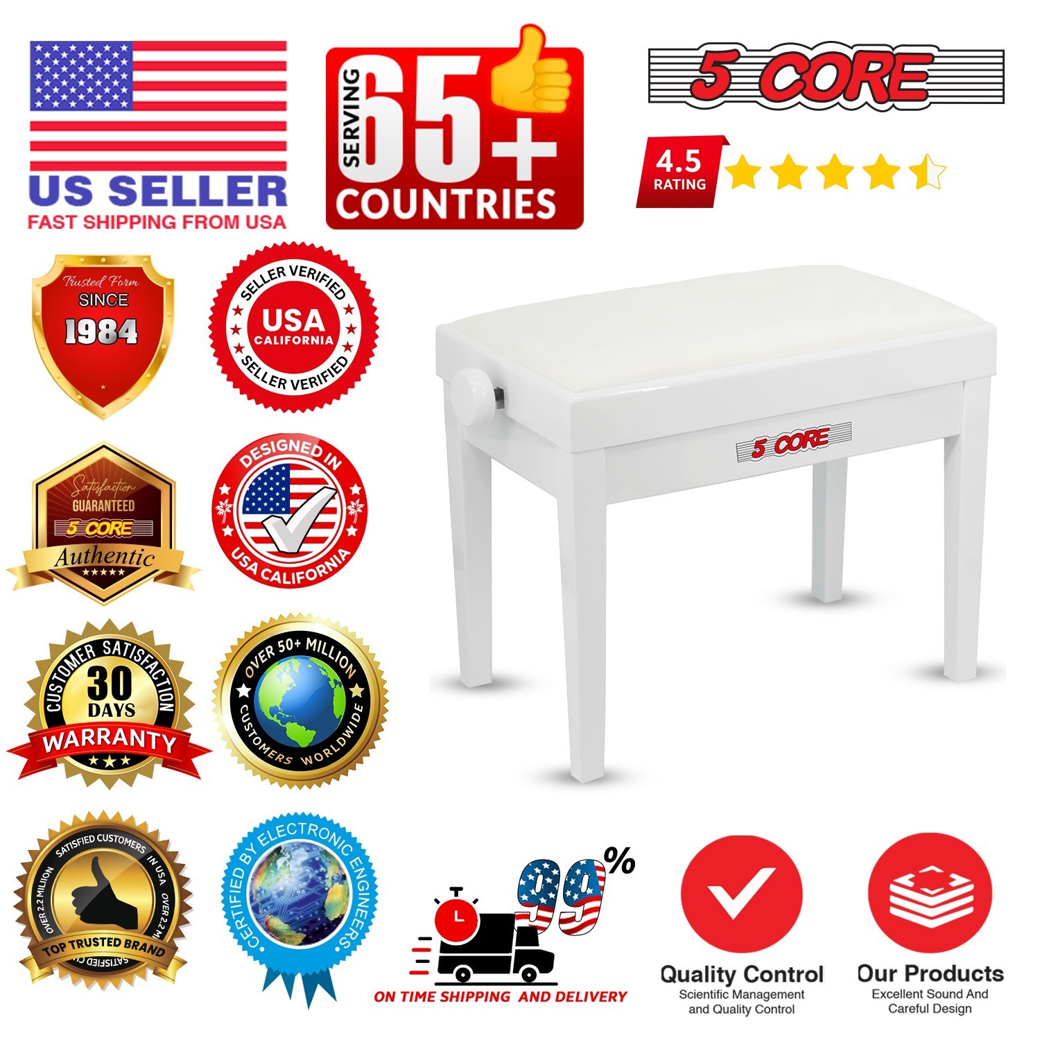 5 Core Piano Bench Height Adjustable Padded Cushion Solid Wood Keyboard Stool