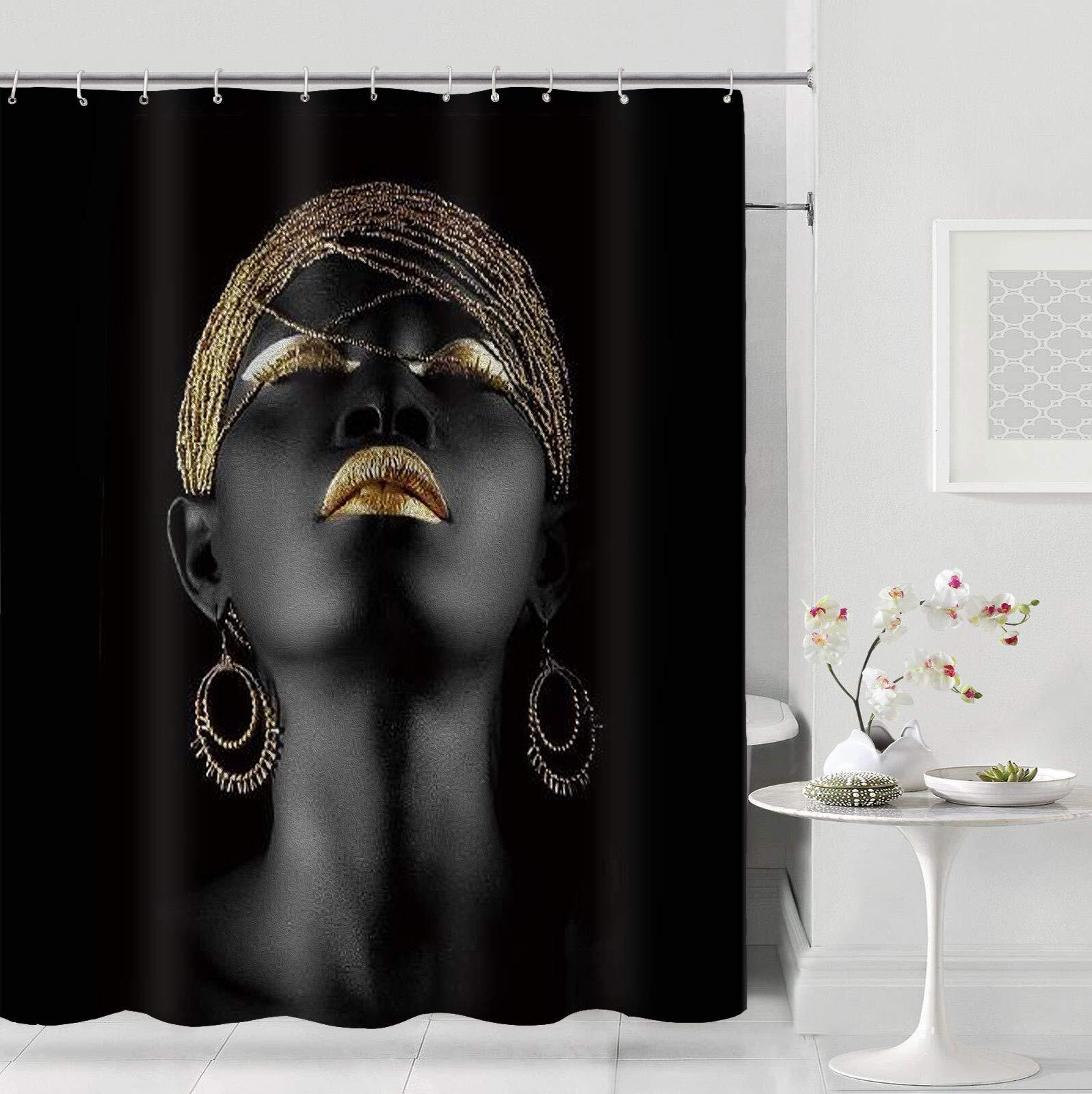 72x72 Black Afro Girl Shower Curtain Golden Lips 12 Hooks LHNT406-72