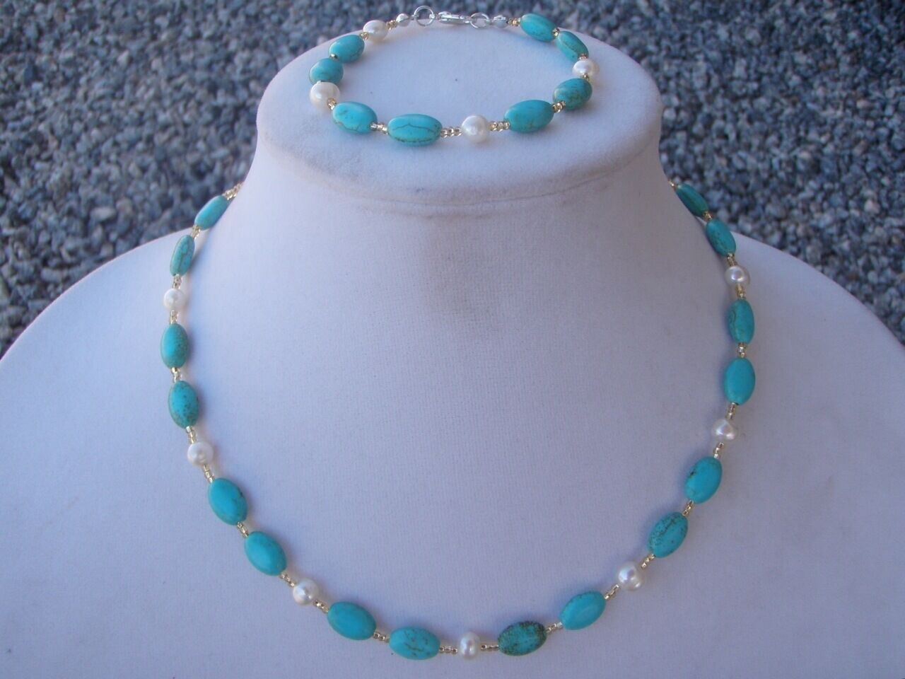Handmade Necklace and Bracelet Set of Turquoise Magnesite Beads and White Pearls