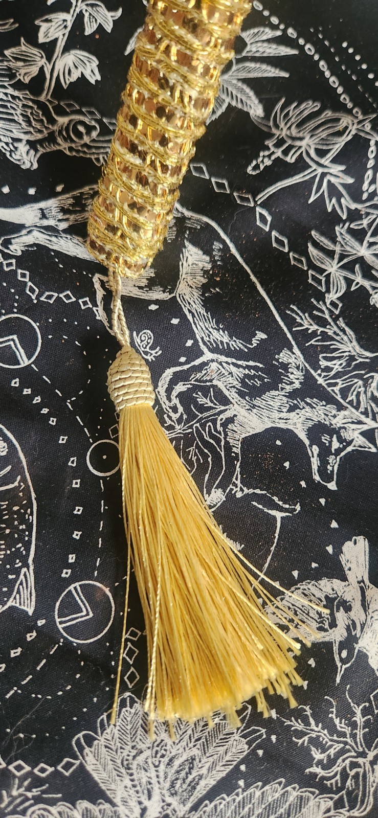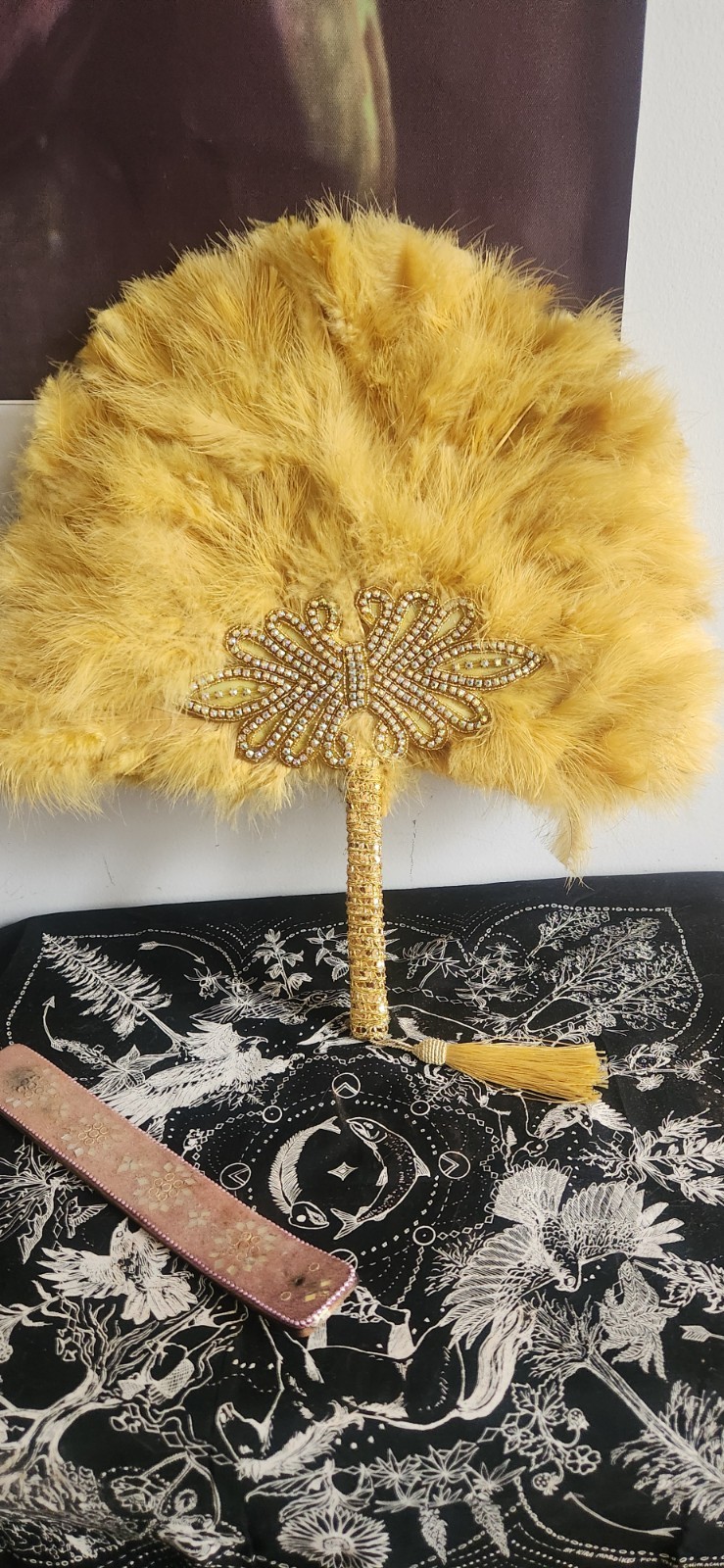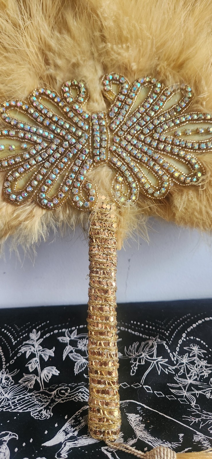 Elegant African Gold Feather Fan with Beaded Handle and Tassle