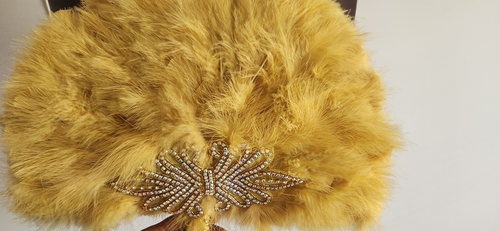 как выглядит Elegant African Gold Feather Fan with Beaded Handle and Tassle фото