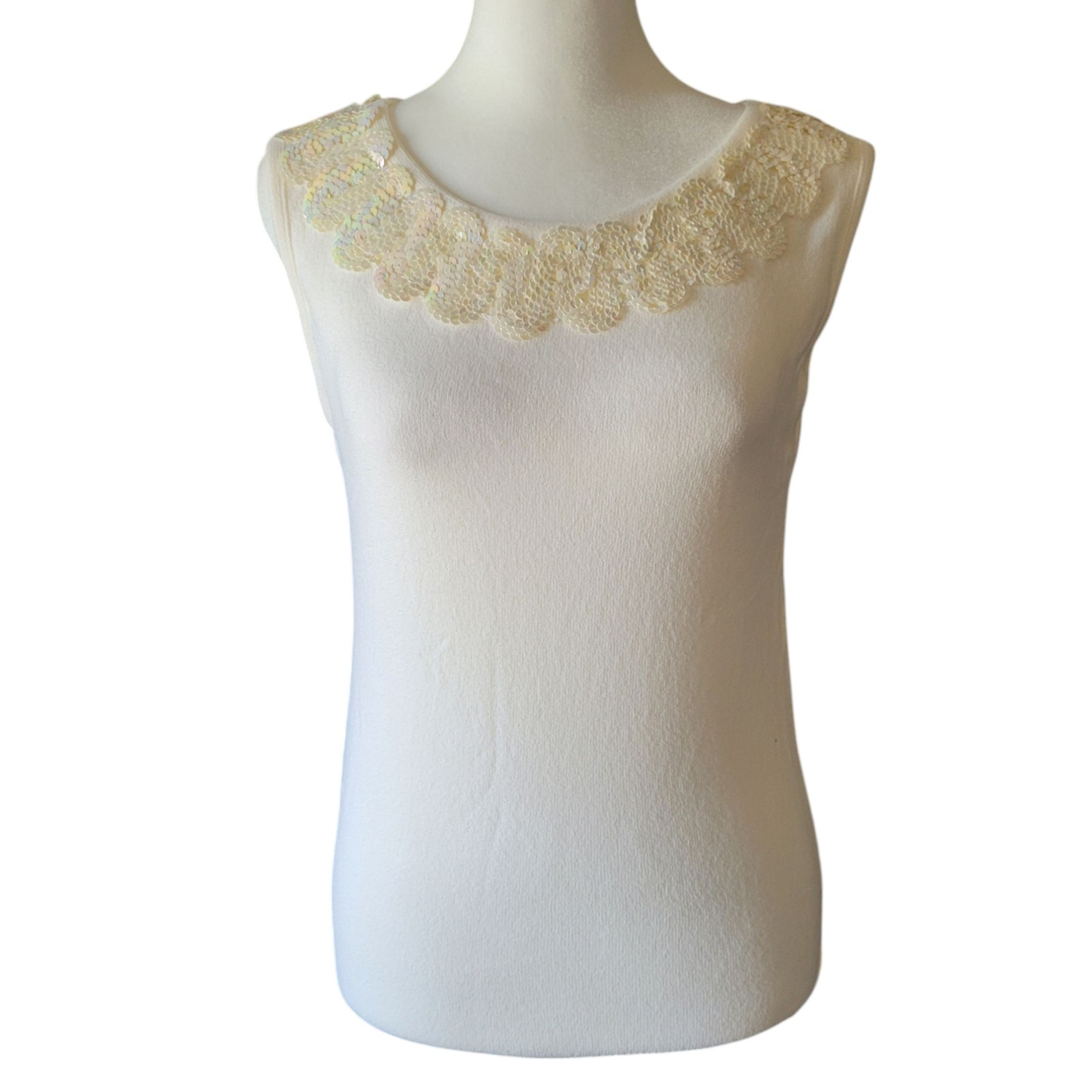 как выглядит Maineliner In Helanca Sleeveless Sequin Ivory Knit Top Vintage 1960s Size 34 фото